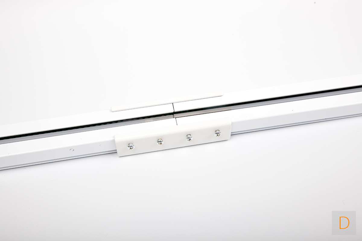 Het installeren van de rails gaat dus door de 3 stukken aan elkaar te maken. Er worden hiervoor beugels bijgeleverd en een soort klem. Ik vond de beugels niet echt heel goed klemmen en ze trekken de rail eerder scheef dan recht.