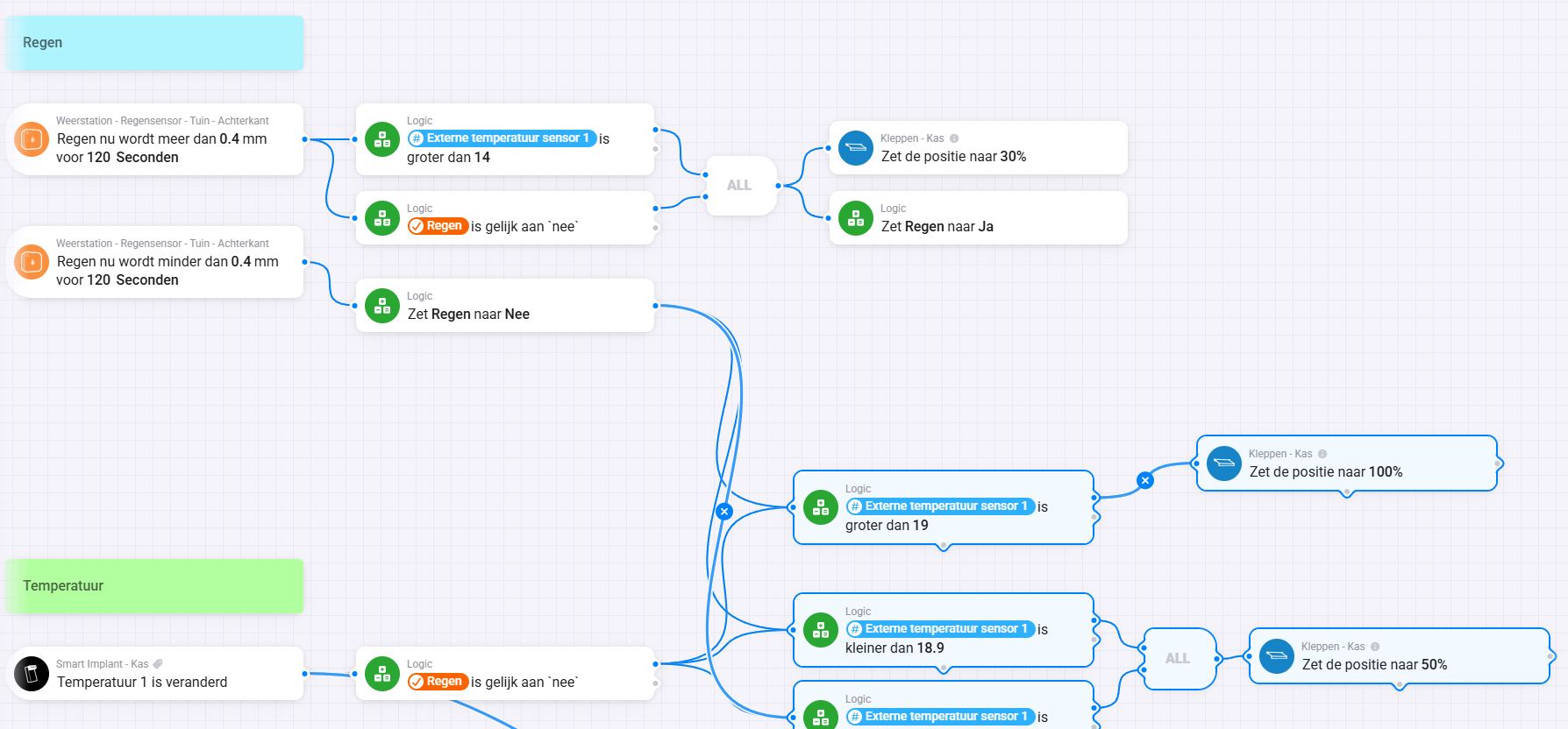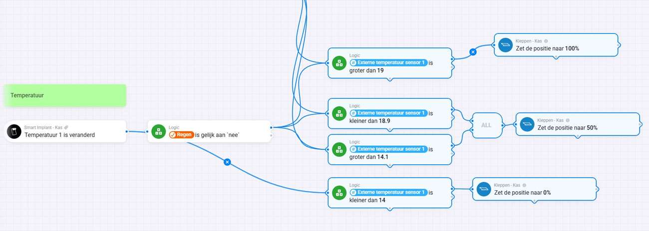 Als startpunt gebruiken we de temperatuursensor. In ons geval willen we dat de kleppen open gaan als het 19 graden is.
