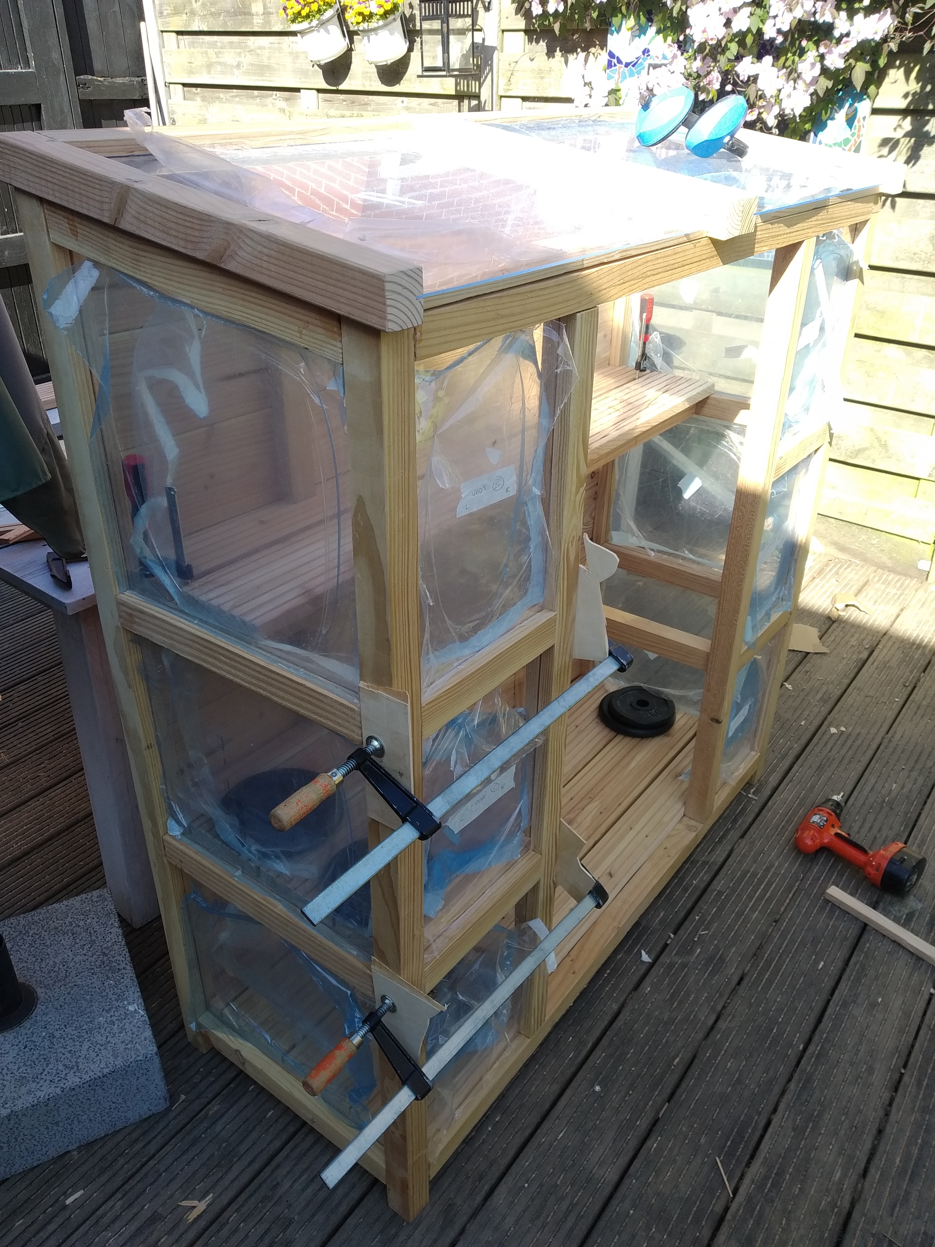 De verbindingen hebben we gemaakt met pen-en-gatverbindingen en verlijmd met lijm die geschikt is voor buitengebruik. Hierdoor zit het geheel stevig in elkaar en kan het tegen een stootje. Aan de bovenkant zitten twee kleppen die open en dicht kunnen. Om goed bij de planten te kunnen, hebben we een deur gemaakt die volledig open kan wel zo handig.
