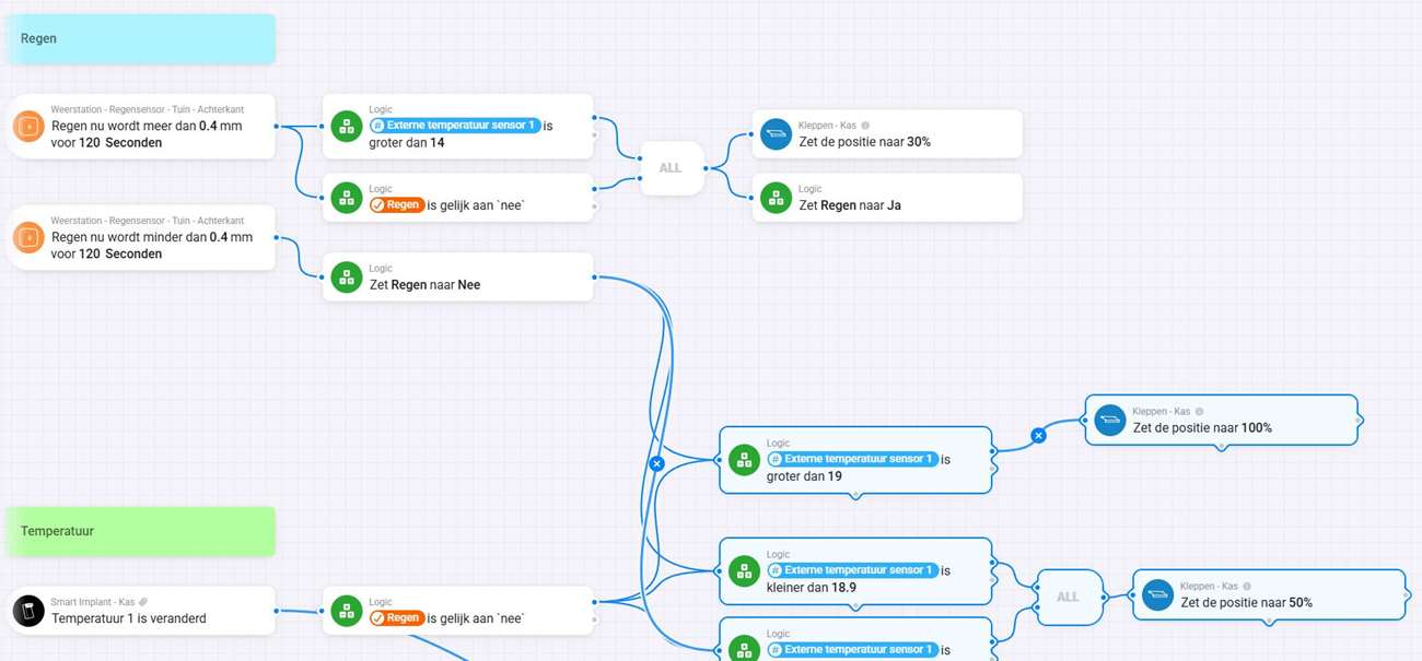 Deze flows hebben bij ons een tijd gedraaid en dit werkte perfect. Het enige waar we tegenaan liepen, is dat als het gaat regenen er een laag water op de klep komt te staan. Dit is niet zo wenselijk. Nu heeft de Homey een buienradar APP. Hiermee kun je zien of er regen gaat vallen. Hiervoor hebben we een flow gemaakt, dat als er regen aan komt de klep dicht moet en weer open als het gestopt is. Maar helaas werkte dit niet helemaal fijn. Dit komt omdat de buienradar APP niet zo lokaal is en hierdoor hadden we vaak dat de kleppen te laat dicht gingen. Het gebeurde ook vaak genoeg dat het helemaal niet regende en de klep dicht ging. Nu is dit minder erg maar uiteraard niet ideaal.