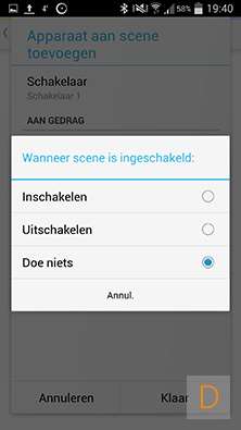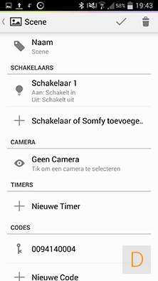 Met scenes kan je bv meerdere schakelaars om een bepaalde tijd aan-/uitzetten. Je kunt ook aan een scene een knopje op de afstandsbediening koppelen.