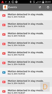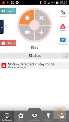 Je kunt tevens de binnentemperatuur zien (via de sensor in de Piper) en de buitentemperatuur (via het web). Onder de status vind je de laatste evenementen. Aan de rechterkant zie je de instellingen, aantal evenementen en je opnames.