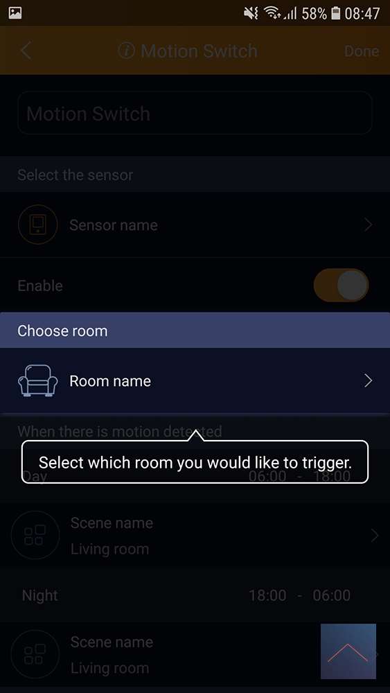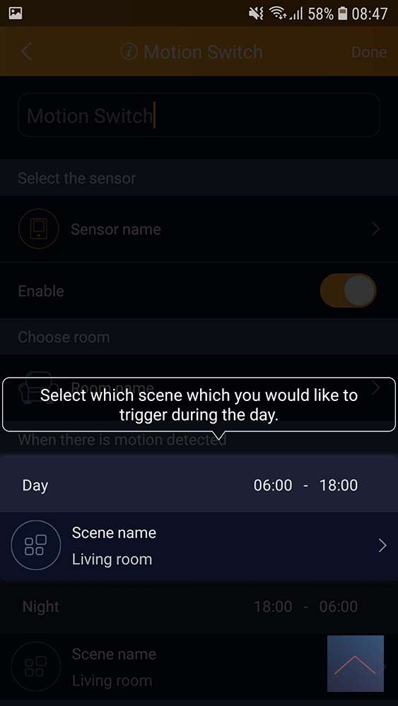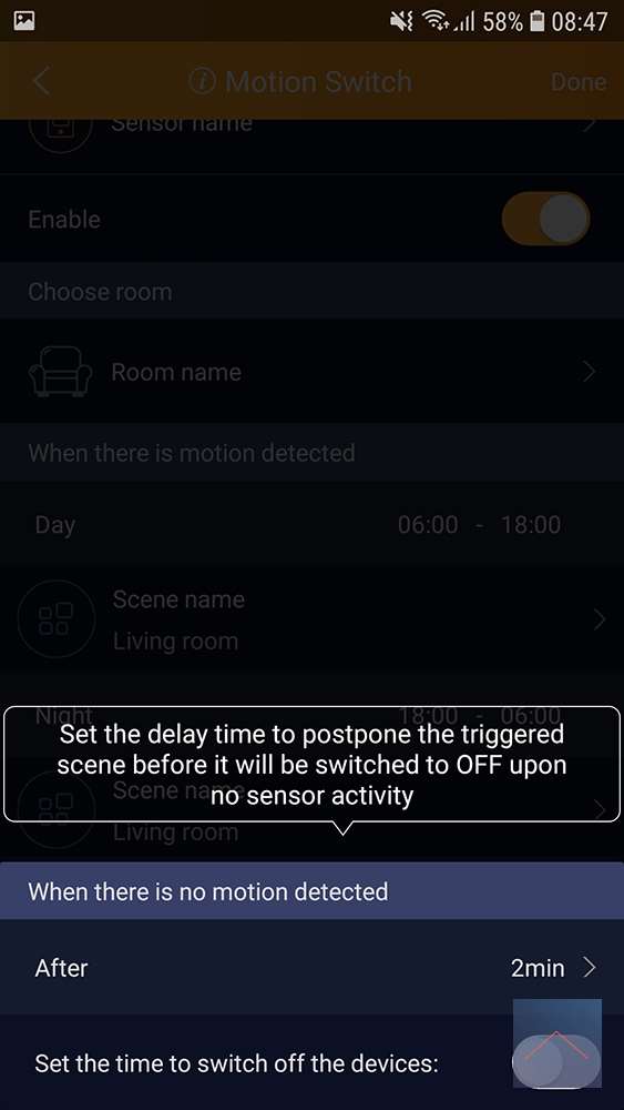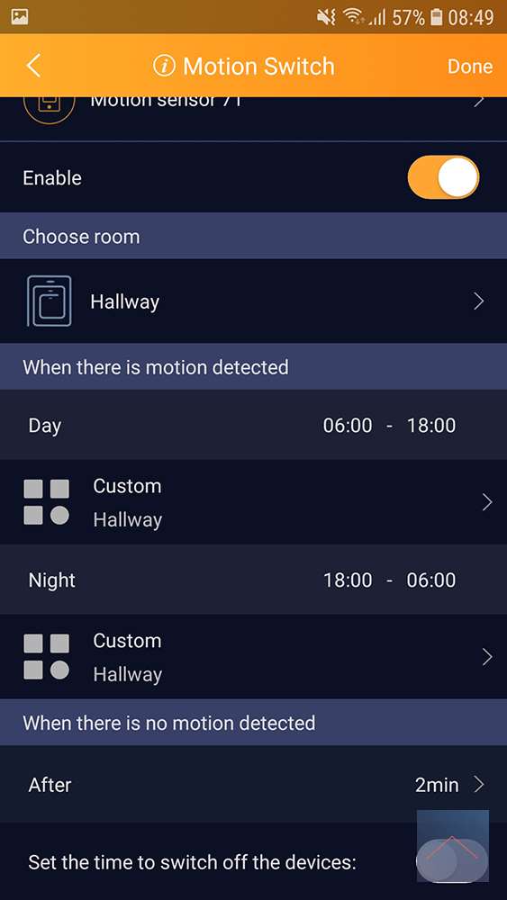 Hierbij kan je ook kiezen uit dag en nacht, waarbij de tijden in te stellen zijn. als je wilt kunt je ook aangeven aan hoelang je wilt dat de lamp blijft branden als er geen beweging meer is geweest, hierbij is de max 59 minuten.