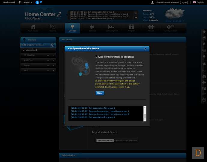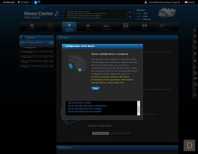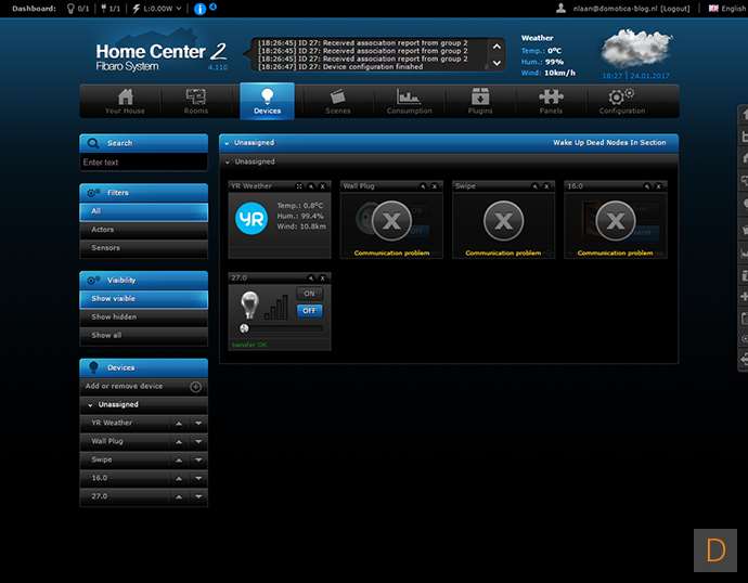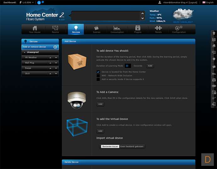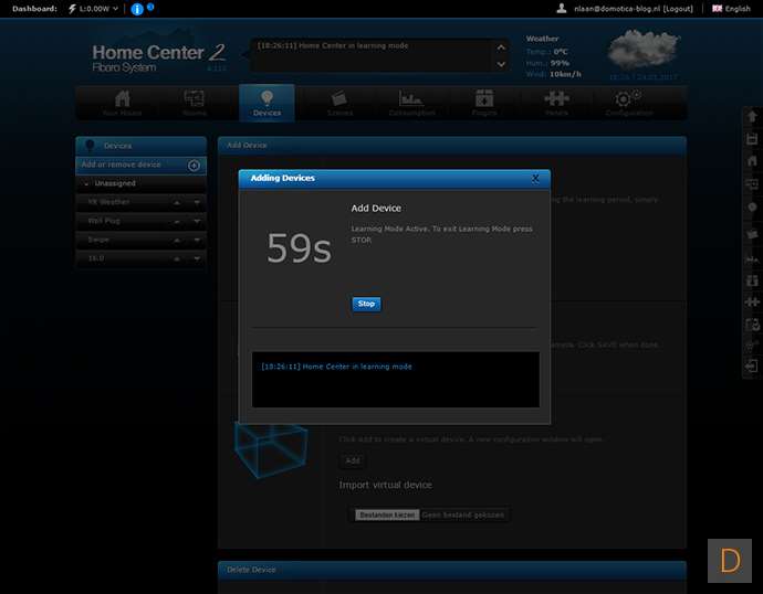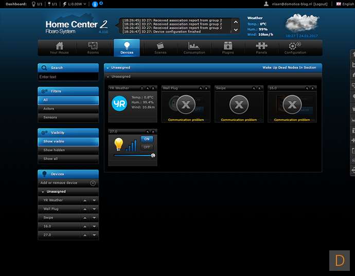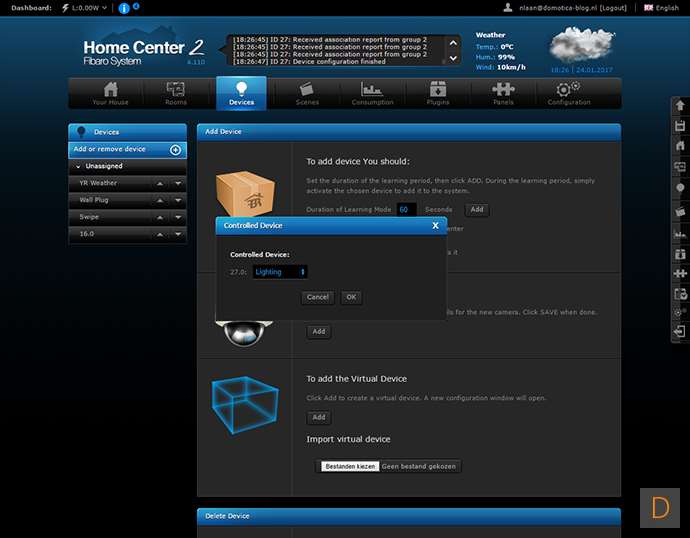 Ik heb de lamp ook toegevoegd aan de Fibaro HC2. Dit doe je door in te loggen en naar het device gedeelte te gaan. Vervolgens klik je op "add or remove device" en op de add knop. Hierna moet je de lamp uit en aan doen om hem toe te voegen. Als het toevoegen is gelukt zal hij oplichten.