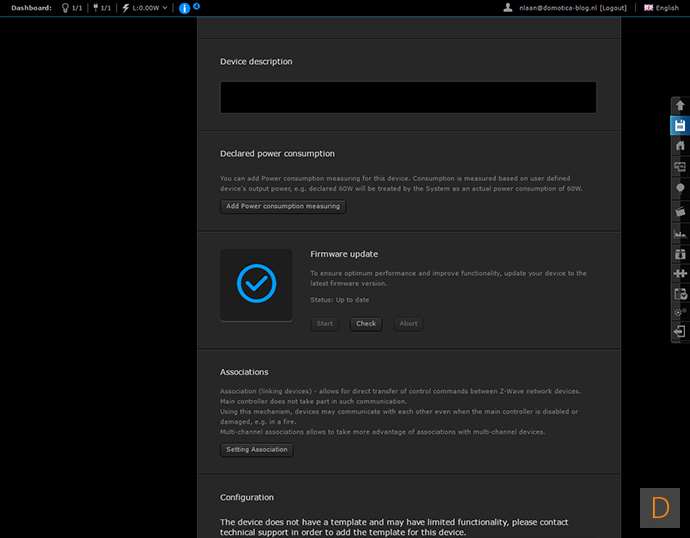 Er wordt gemeld dat er geen template gevonden is. Dus dit beloofd meestal niet veel goeds. Mijn vermoedens kloppen ook want op het dashboard kun je alleen de lamp aan/uitzetten en het lichtniveau bepalen. Er is dus geen optie om de kleuren te veranderen.