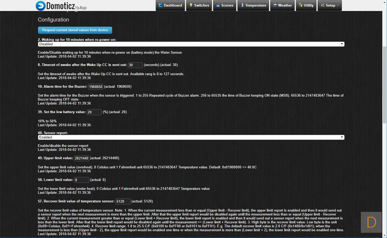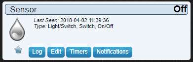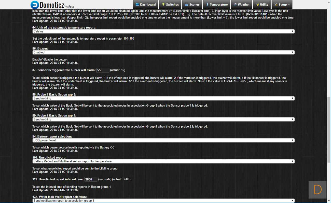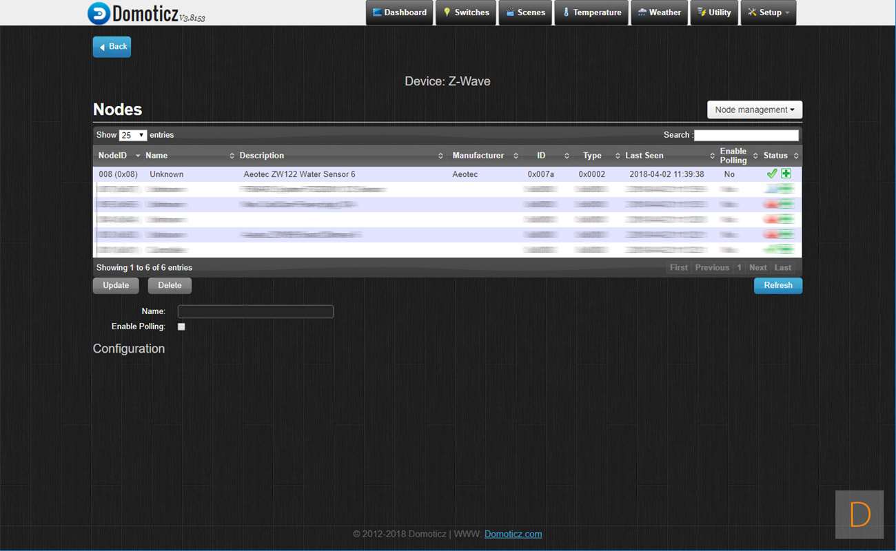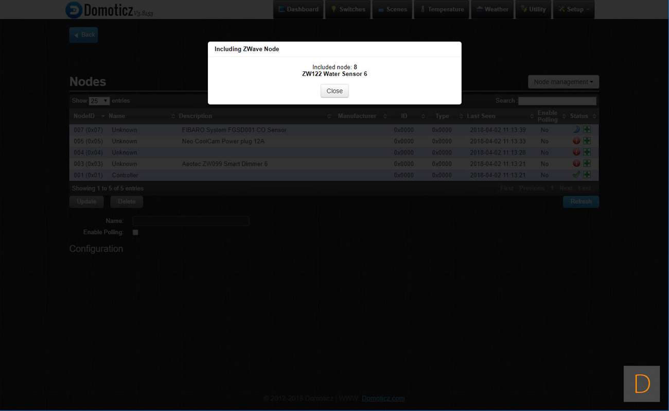 Het toevoegen aan Domoticz gaat door in te loggen en naar het menu item setup te gaan en dan naar hardware en dan de setup van de Aeon labs controller/stick. Vervolgens klik je rechts op include node en verwijder je het lipje bij de batterij (even hard trekken) de sensor zal van kleur veranderen en groen oplichten en een piep geven. De sensor werd toegevoegd en ik zie de watersensor bij de configuratie. De temperatuurmeter wordt niet gevonden. De watersensor wordt alleen niet juist op mijn dashboard weergeven (als aan/uit sensor). Dit kun je gelukkig wijzigen in de configuratie van het sensor.