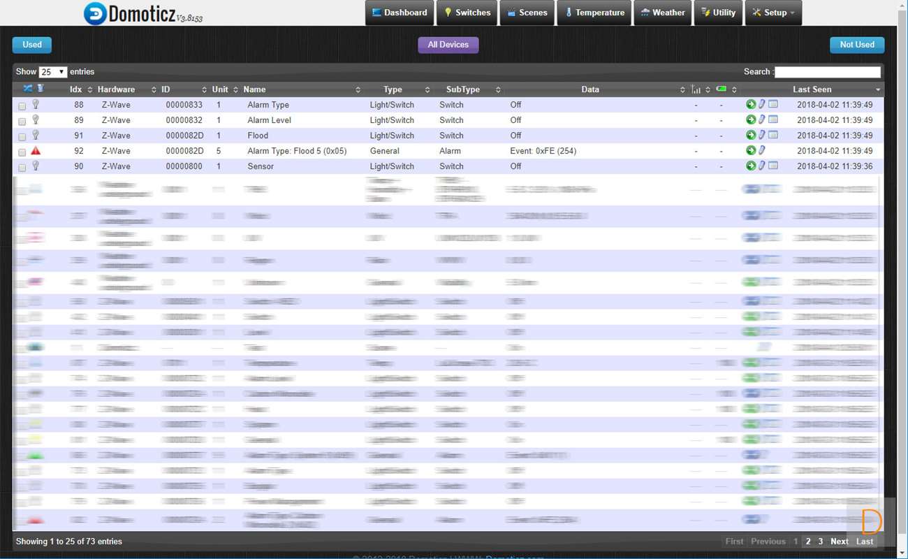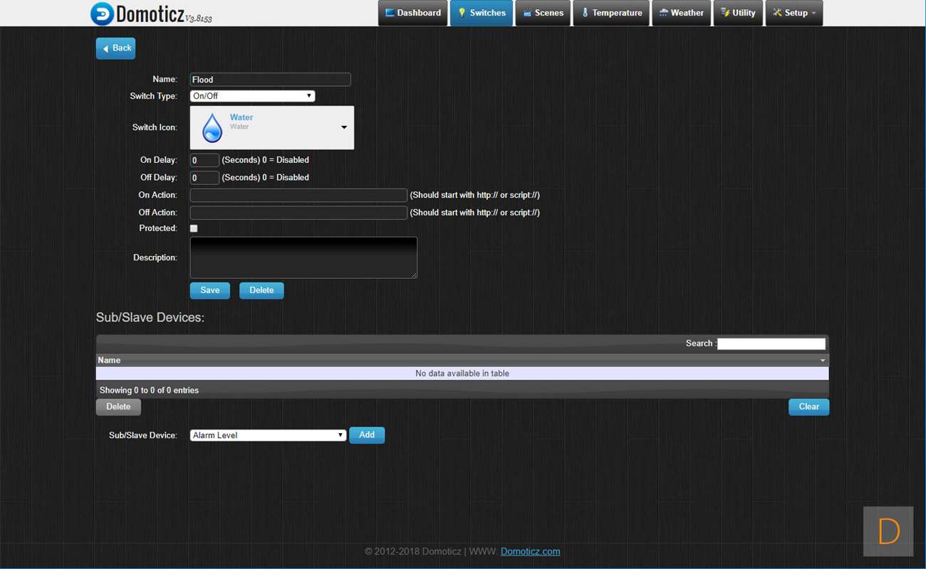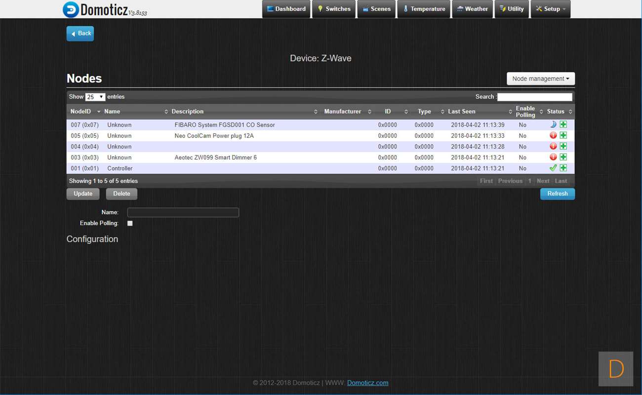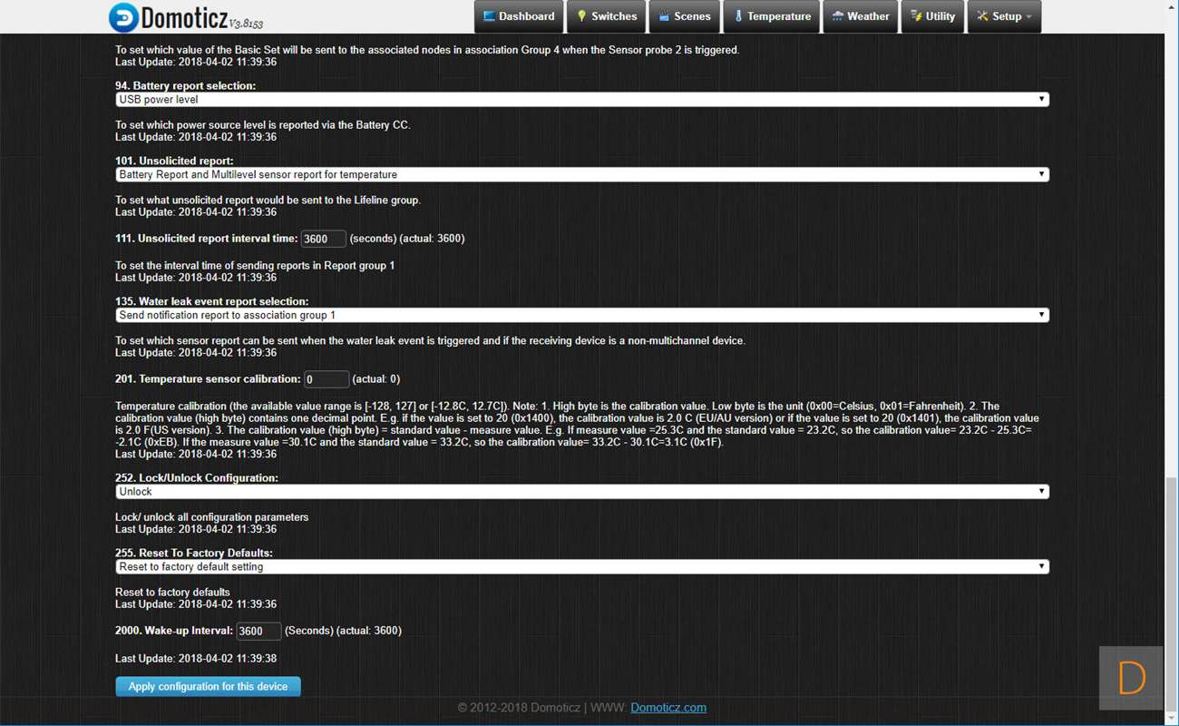 Het toevoegen aan Domoticz gaat door in te loggen en naar het menu item setup te gaan en dan naar hardware en dan de setup van de Aeon labs controller/stick. Vervolgens klik je rechts op include node en verwijder je het lipje bij de batterij (even hard trekken) de sensor zal van kleur veranderen en groen oplichten en een piep geven. De sensor werd toegevoegd en ik zie de watersensor bij de configuratie. De temperatuurmeter wordt niet gevonden. De watersensor wordt alleen niet juist op mijn dashboard weergeven (als aan/uit sensor). Dit kun je gelukkig wijzigen in de configuratie van het sensor.