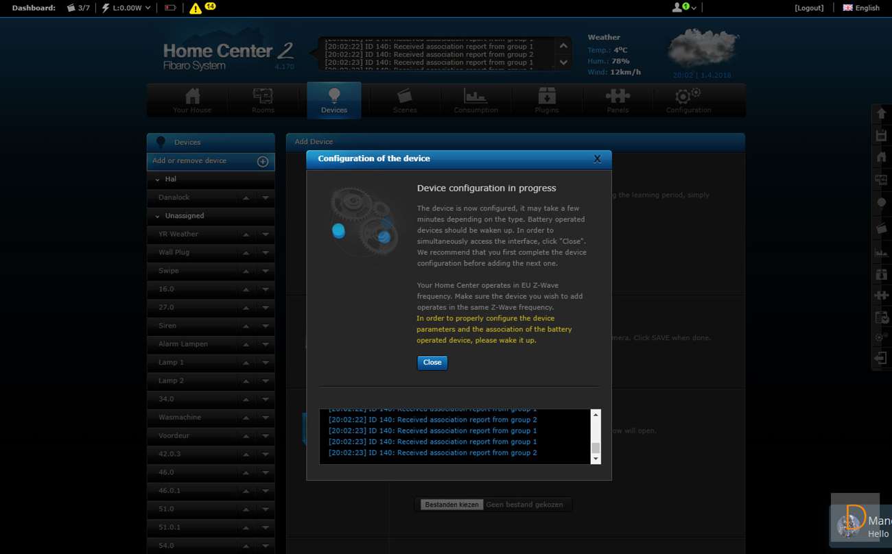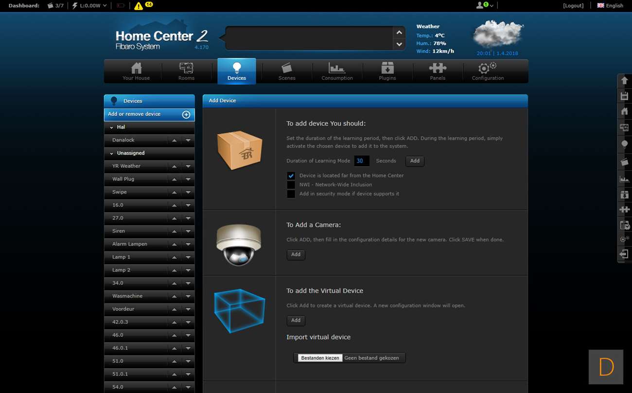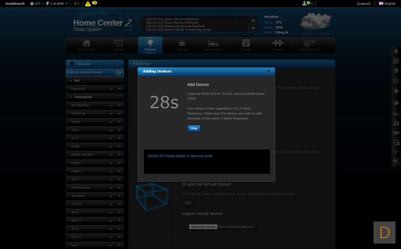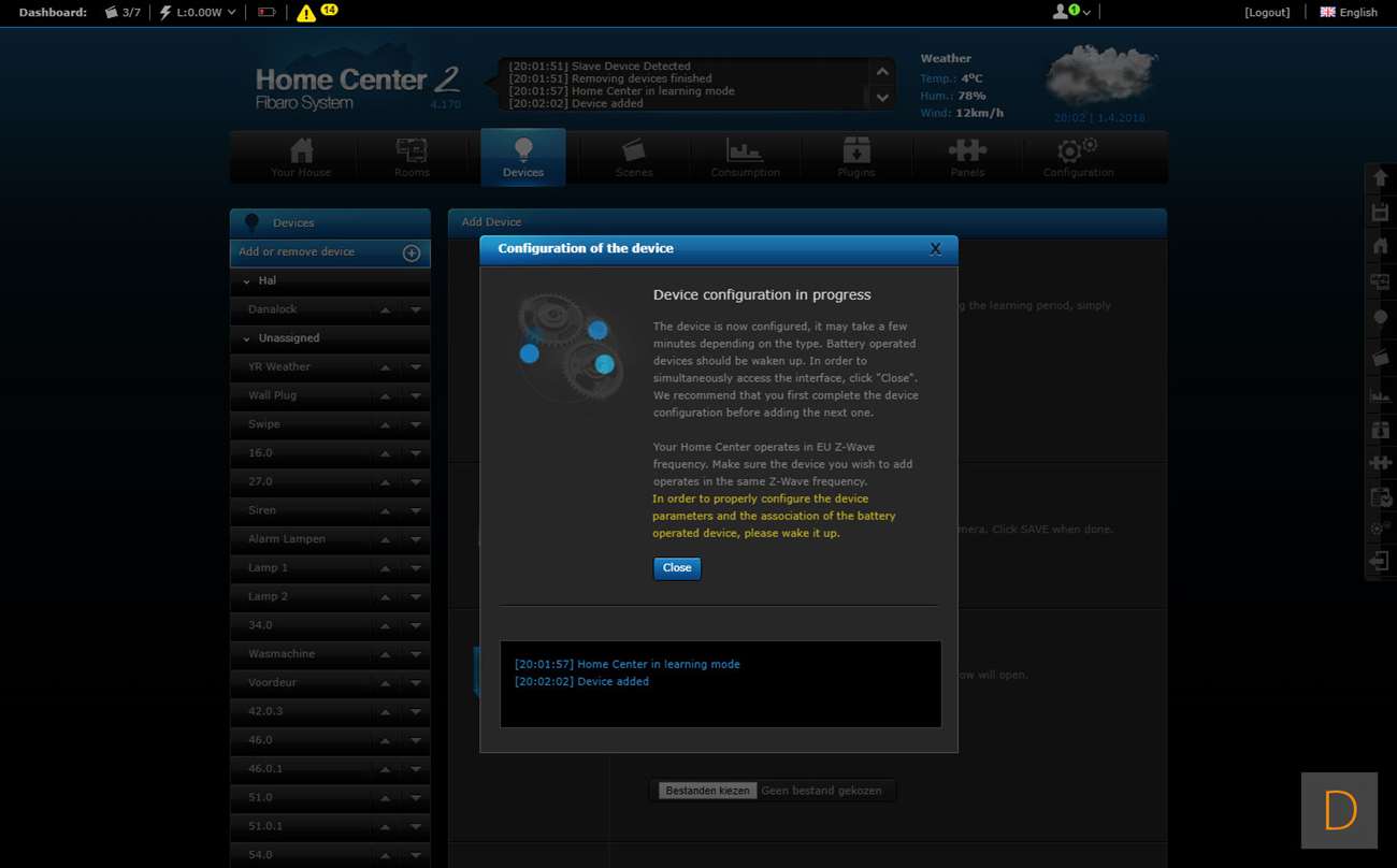 De volgende controller is Fibaro Home Center 2. Je kunt het toevoegen starten door in te loggen op de HC2 en naar het "device" gedeelte te gaan. Vervolgens klik je op "add or remove device" en op "add". Hierna trek je het lipje bij de batterij weg (hard trekken). De sensor zal dan gaan veranderen van kleur en als hij gevonden is door de controller groen oplichten en een piep geven. De LED zal hierna geel gaan knipperen. Mocht dit overigens niet gebeuren dan moet je op het knopje aan de voorkant klikken. Hij werd toegevoegd en ik zie de watersensor, de temperatuurmeter. Het vreemde is alleen dat alles dubbel wordt toegevoegd en ik er ook een bewegingsmelder bij krijg. Deze laatst zou de schoksensor kunnen zijn maar toont alleen geen activiteit.