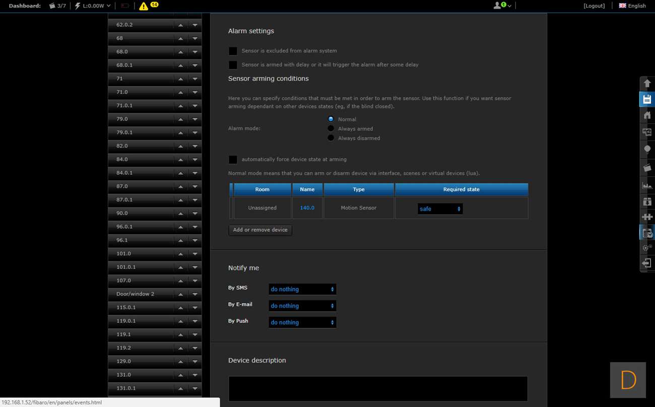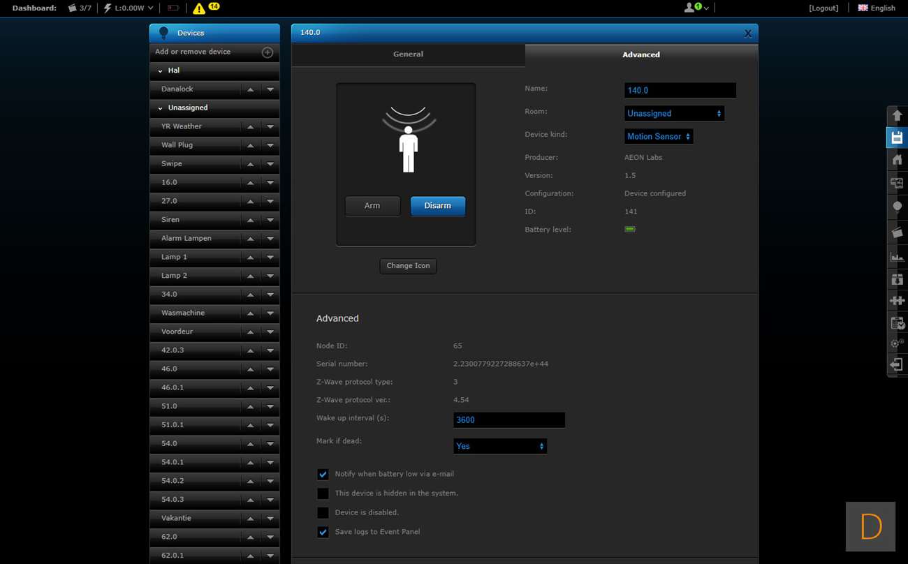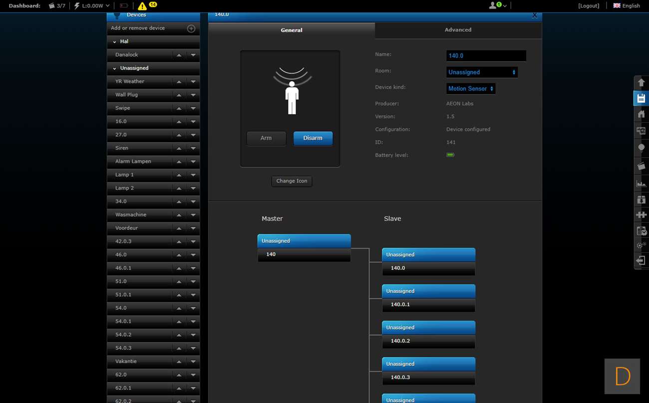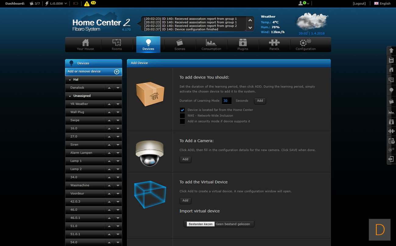 De volgende controller is Fibaro Home Center 2. Je kunt het toevoegen starten door in te loggen op de HC2 en naar het "device" gedeelte te gaan. Vervolgens klik je op "add or remove device" en op "add". Hierna trek je het lipje bij de batterij weg (hard trekken). De sensor zal dan gaan veranderen van kleur en als hij gevonden is door de controller groen oplichten en een piep geven. De LED zal hierna geel gaan knipperen. Mocht dit overigens niet gebeuren dan moet je op het knopje aan de voorkant klikken. Hij werd toegevoegd en ik zie de watersensor, de temperatuurmeter. Het vreemde is alleen dat alles dubbel wordt toegevoegd en ik er ook een bewegingsmelder bij krijg. Deze laatst zou de schoksensor kunnen zijn maar toont alleen geen activiteit.
