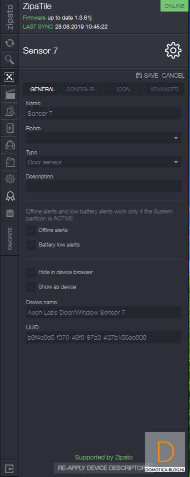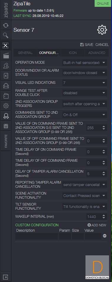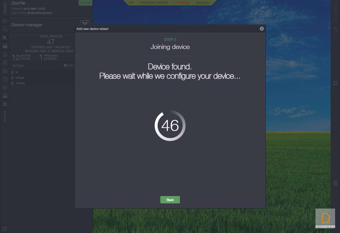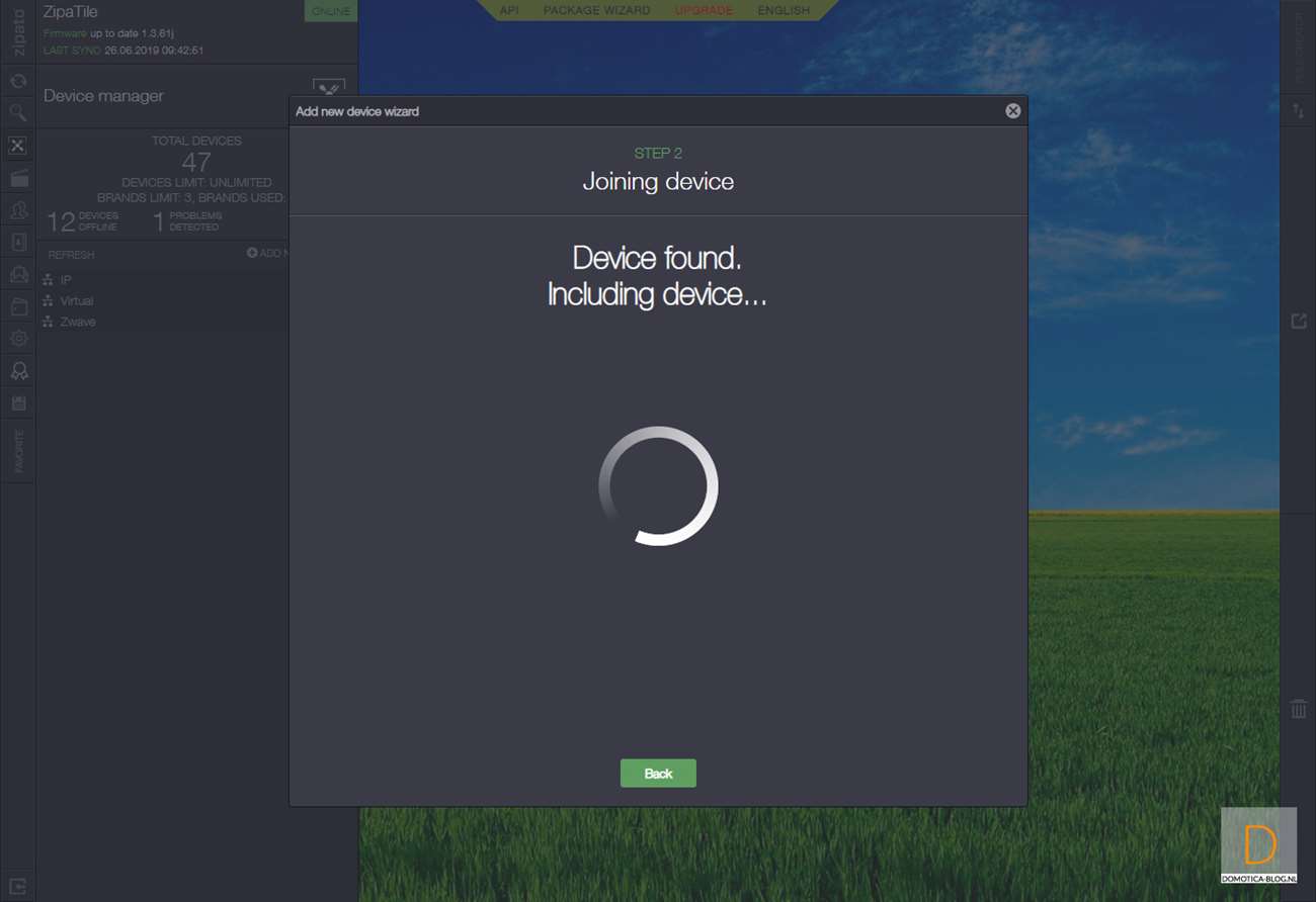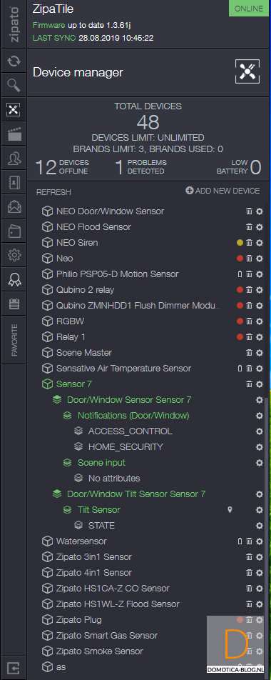 Volgende controller is de Zipabox. Als eerste halen we het kapje van de sensor af. Dit kun je doen door het lipje aan de bovenkant in te drukken en het kapje eraf te halen. Vervolgens log je in op Zipabox en ga je naar je apparaten. Klik vervolgens op "add new device" en hierna op Z-Wave. De controller zal eerst de sensor resetten en dan toevoegen. Dit kun je starten door het lipje bij de batterij te verwijderen. Hij werd gereset, waarna we 3x binnen 1,5 seconde op de tamper schakelaar moesten drukken aan de zijkant van de sensor.