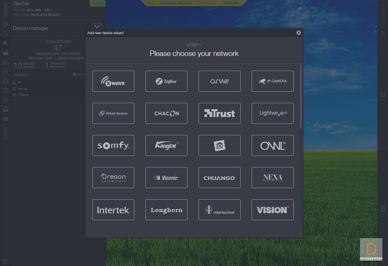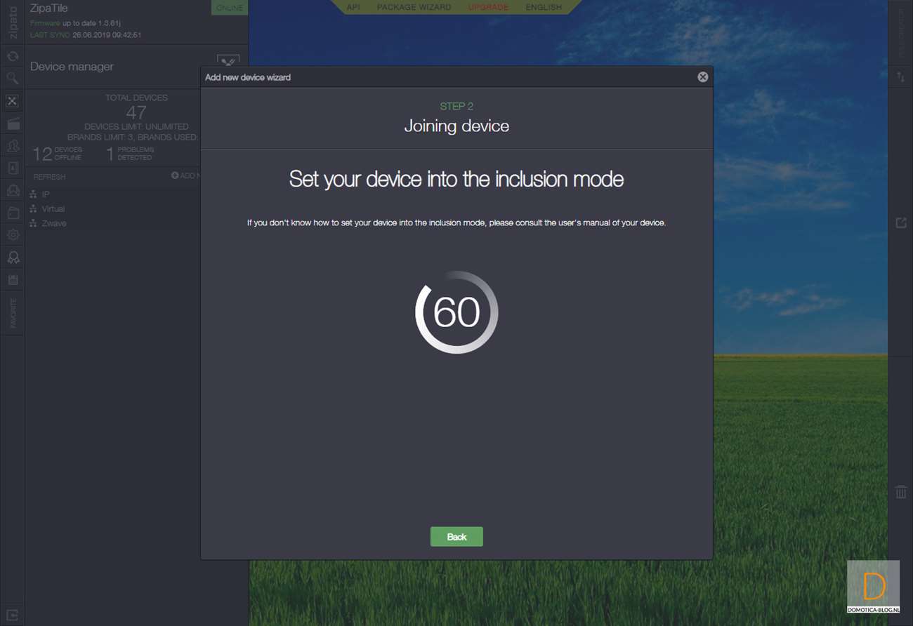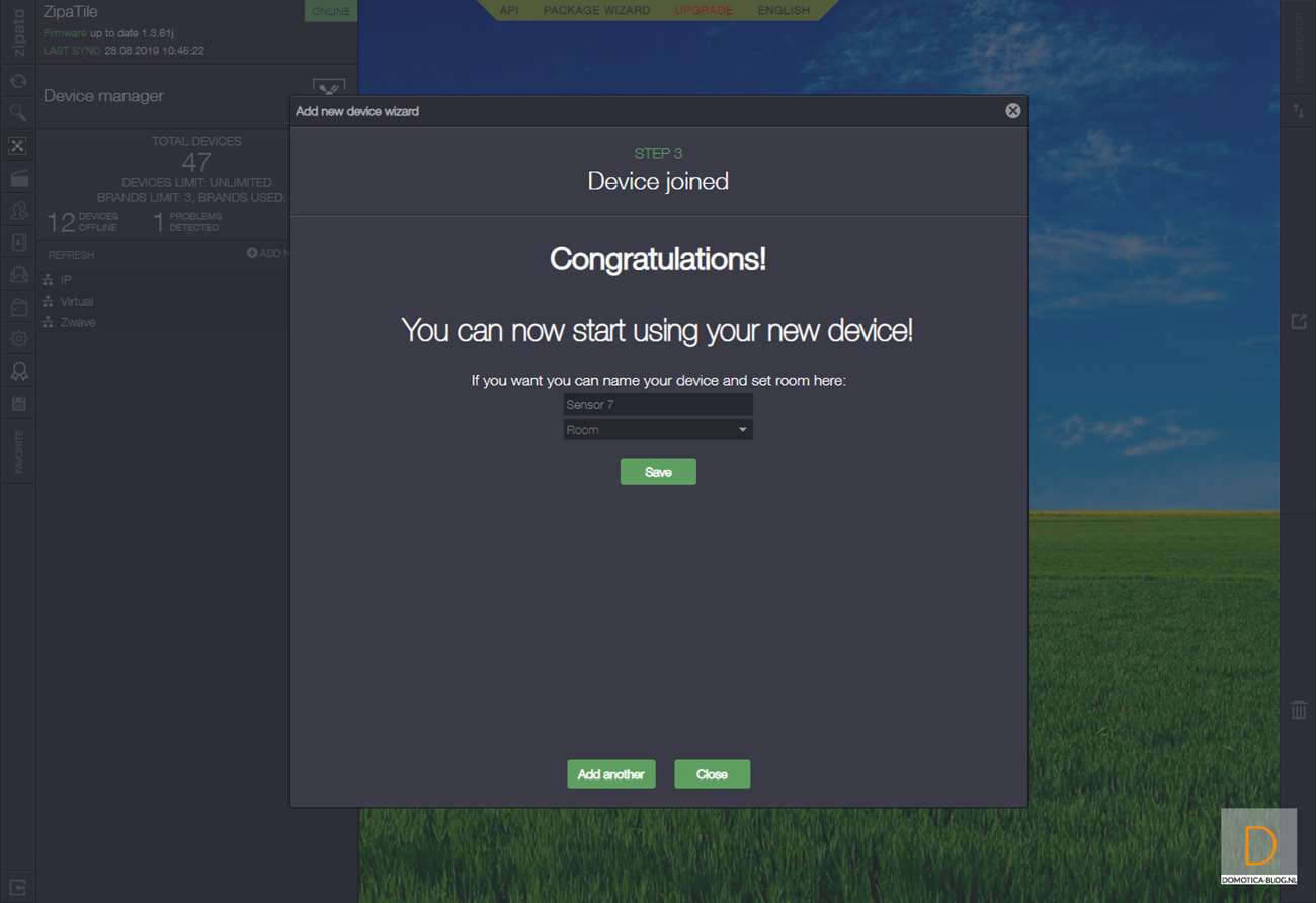 Volgende controller is de Zipabox. Als eerste halen we het kapje van de sensor af. Dit kun je doen door het lipje aan de bovenkant in te drukken en het kapje eraf te halen. Vervolgens log je in op Zipabox en ga je naar je apparaten. Klik vervolgens op "add new device" en hierna op Z-Wave. De controller zal eerst de sensor resetten en dan toevoegen. Dit kun je starten door het lipje bij de batterij te verwijderen. Hij werd gereset, waarna we 3x binnen 1,5 seconde op de tamper schakelaar moesten drukken aan de zijkant van de sensor.