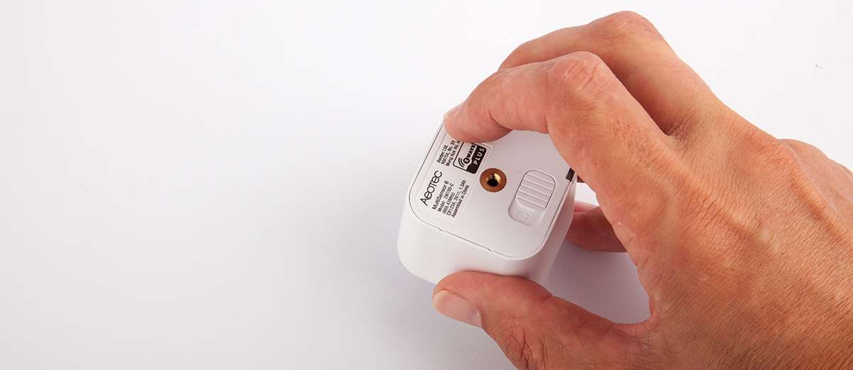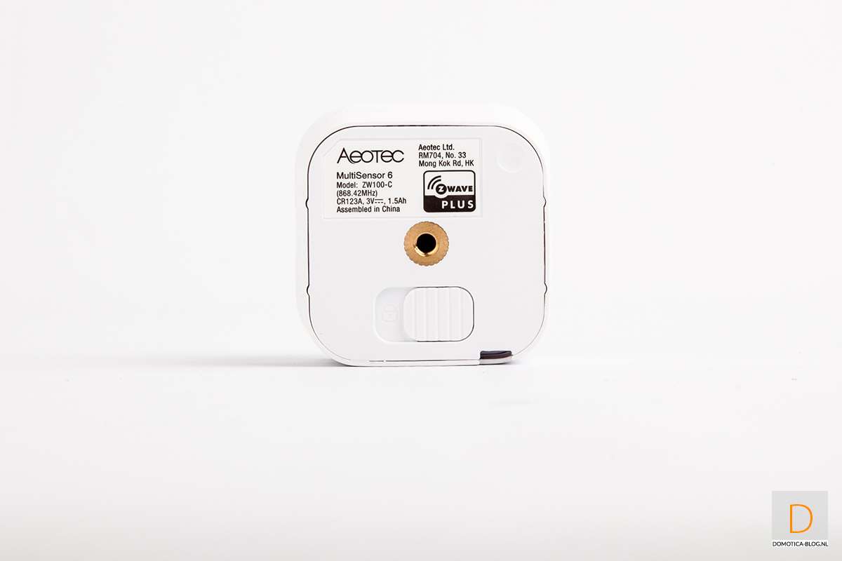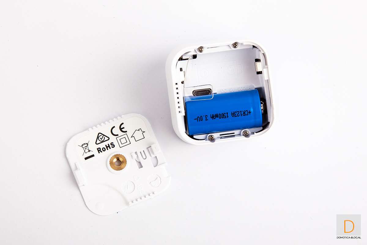 Je kunt hem uiteraard ook gebruiken via een batterij (CR123a). Er is zelfs ruimte voor 2 batterijen zodat je minder snel hoeft te wisselen. Volgens Aeon Labs hoef je pas na 2 jaar de batterijen te vernieuwen.