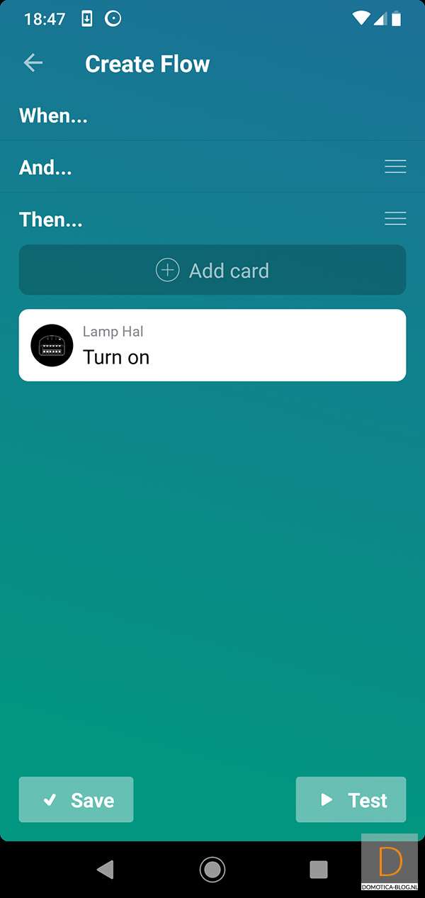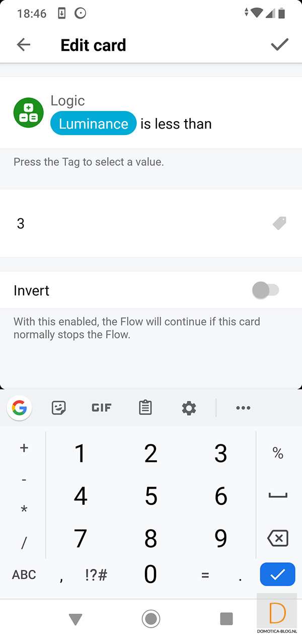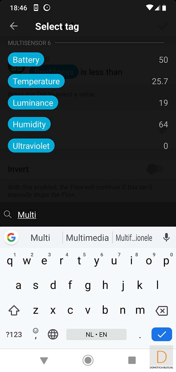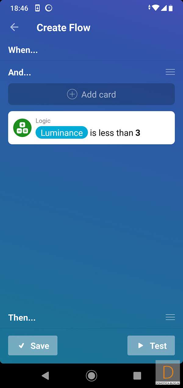 Als voorbeeld wil ik graag dat als er beweging is gedetecteerd, en de lux is lager dan 3, de lamp in de hal aangezet wordt.