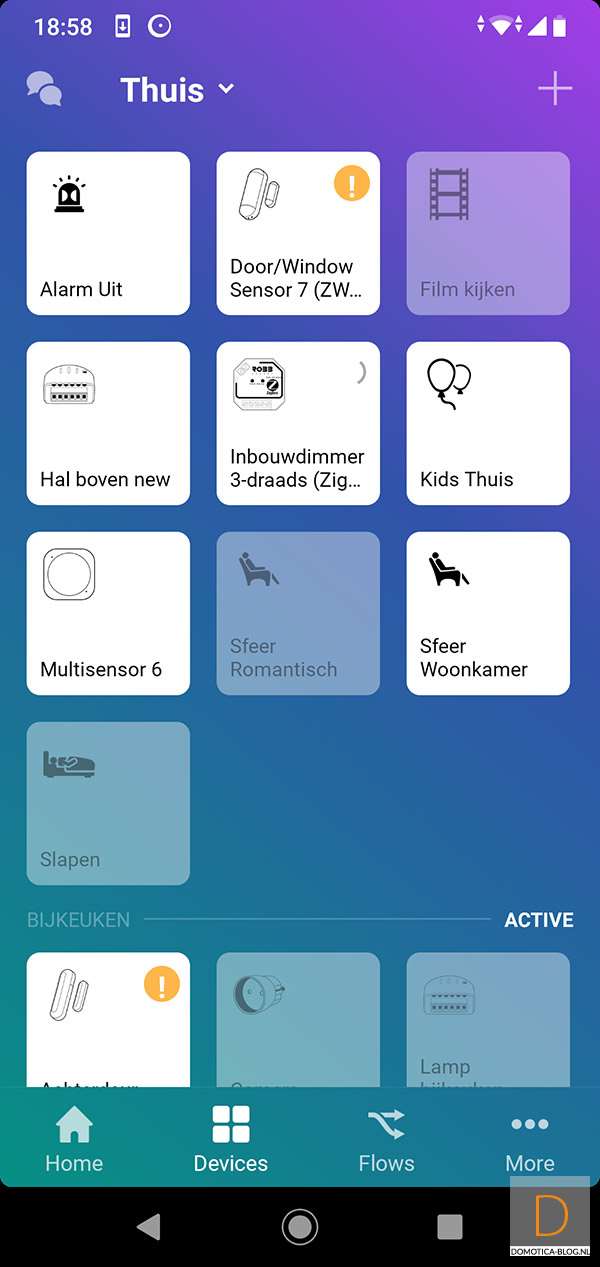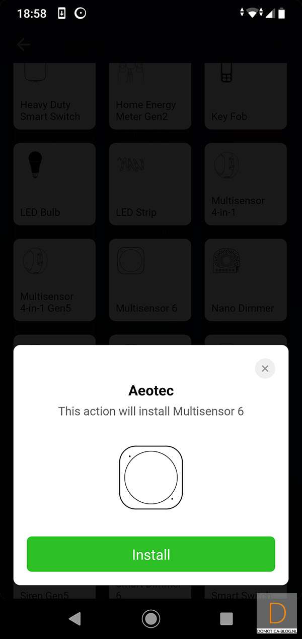 Het installeren van deze motion sensor gaat door naar het apparaten gedeelte te gaan en op het (+) icon te klikken. Vervolgens zoek je de sensor op. Hierna druk je 2x op het knopje aan de binnenkant. Dit knopje is wat lastig in te drukken maar als je het klepje eraf haalt gaat dit een stuk gemakkelijker. Hij zal groen gaan knipperen en vervolgens geel om aan te geven dat het toevoegen is gelukt.