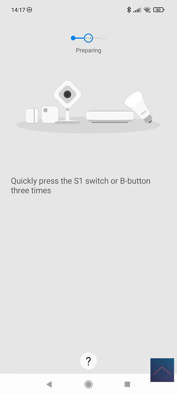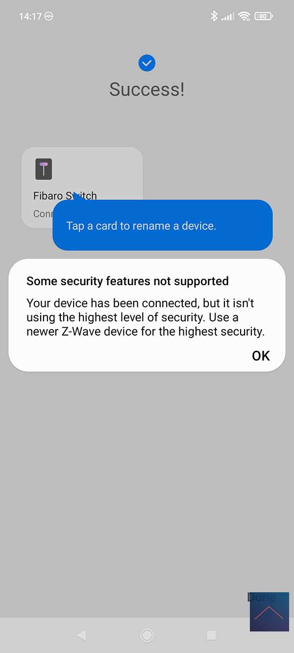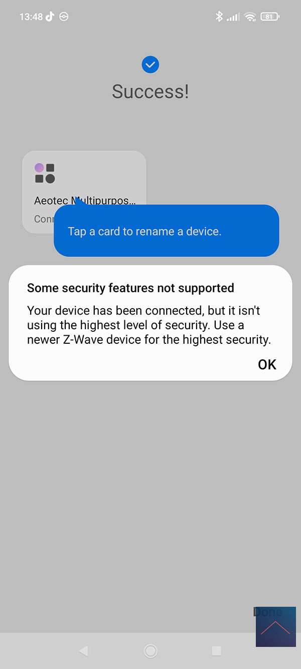 Nu moeten we de sensor in leerstand zetten. Dit kun je doen door het knopje aan de achterkant 3x snel achter elkaar in te drukken. De LED van de sensor zien we geel worden wat aangeeft dat hij aan het leren is/wordt toegevoegd. Na enkele seconden zien we hem verschijnen in de APP en komt er een melding dat hij niet optimaal beveiligd is.