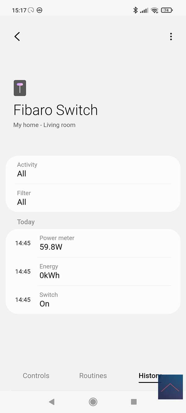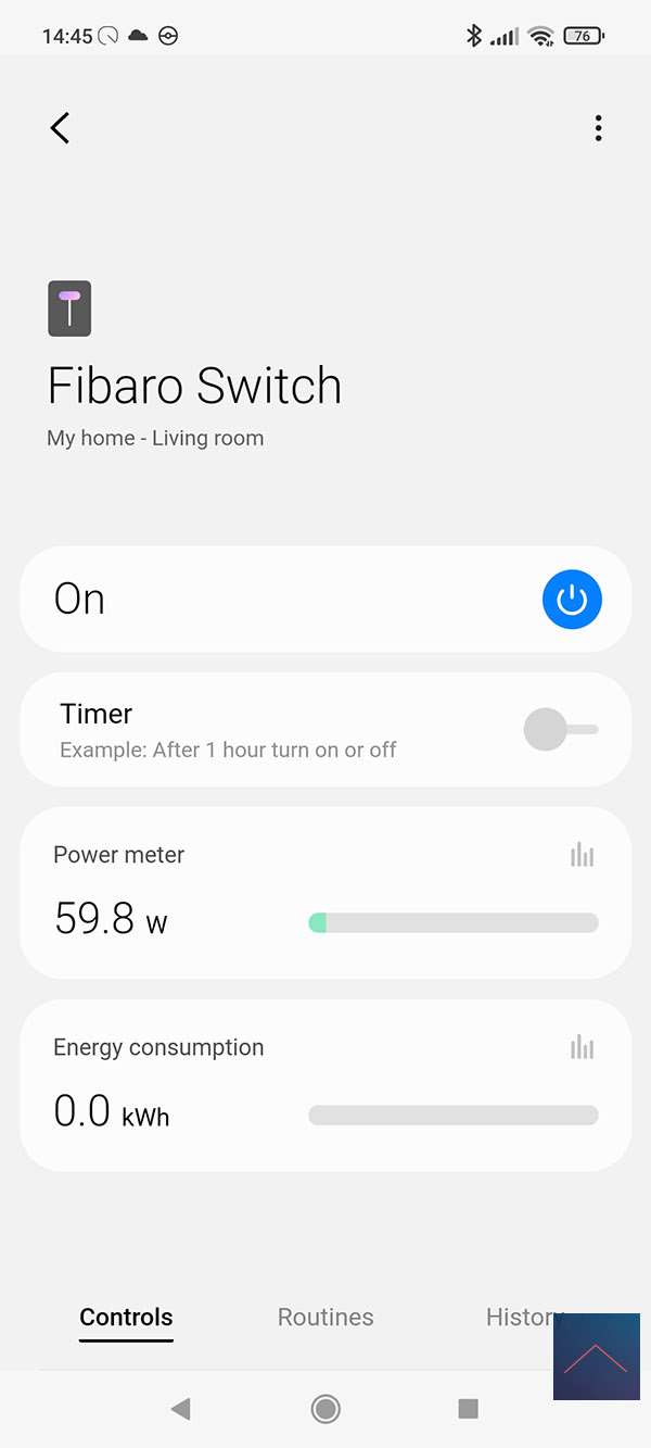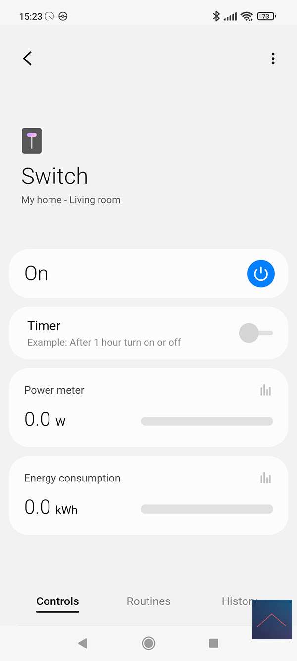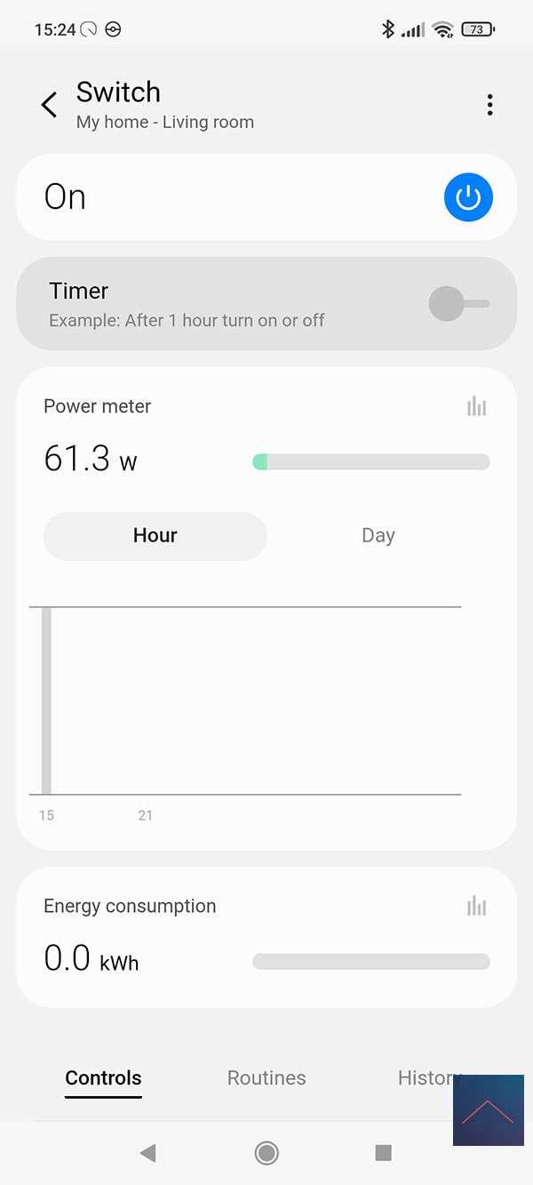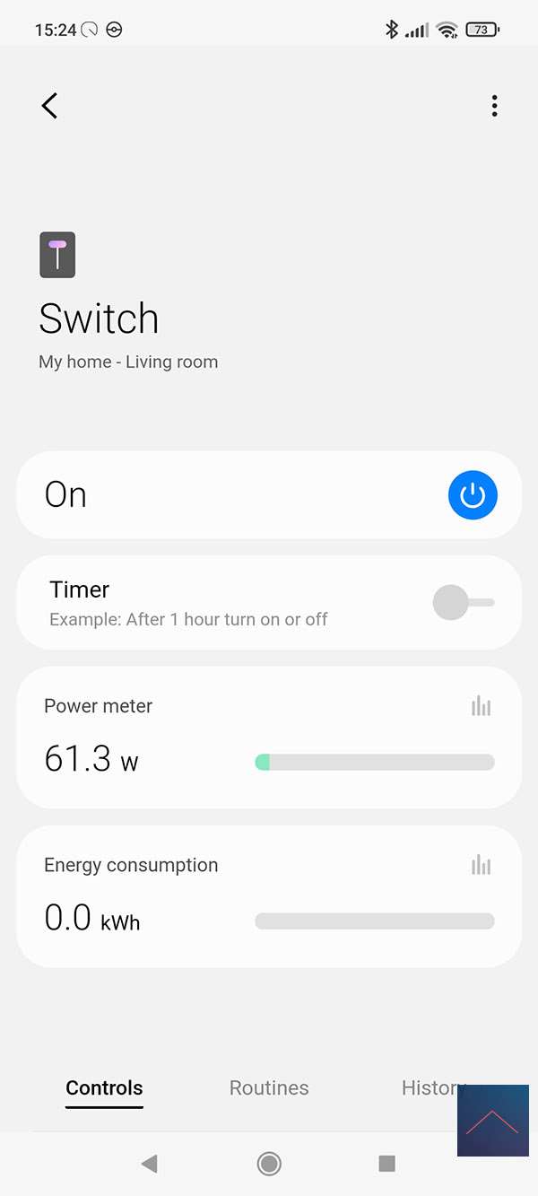 Je krijgt een schakelaar (aan/uit) en je kunt het totaal verbruik en het huidige verbruik in zien. Bij de instelling krijg zien we geen extra configuratie mogelijkheden.