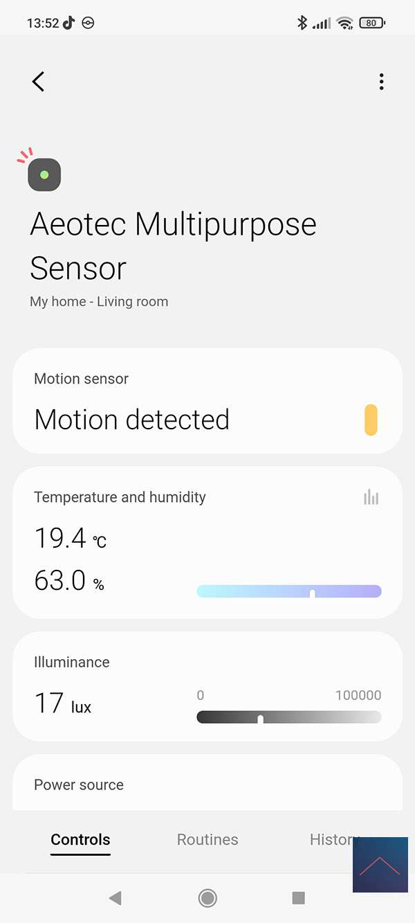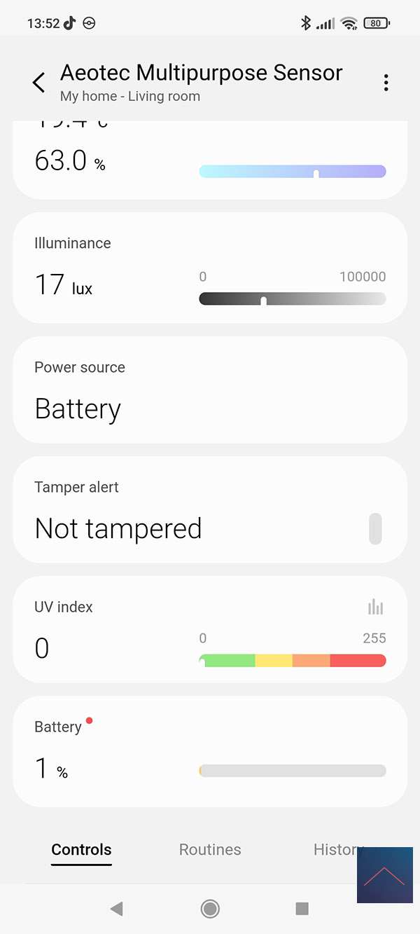 Het duurt ook even tot hij in mijn kamer verschijnd en we de beweging binnen zien komen. Als we de details van de sensor bekijken zien we ook de temperatuur, lux waarde, luchtvochtigheid, UV waarde en het batterijniveau.