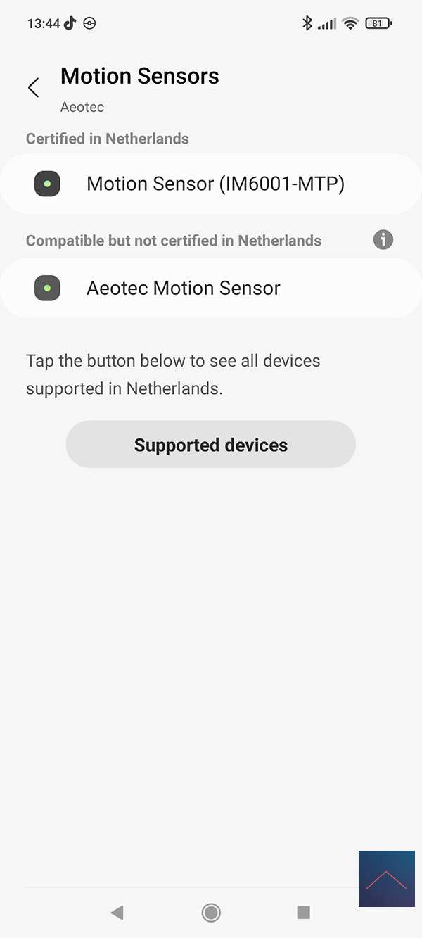 Om het toevoegen te starten gaan we naar de APP en klikken op het plusje rechtsboven in het startscherm. We drukken vervolgens op brand, Aeotec en motion sensors. We krijgen nu een selectie waarbij vermeld staat dat onze Multisensor niet in Nederland net gecertificeerd is. Nu moeten we even de achterkant van de sensor loshalen en de lipjes bij de batterij verwijderen zodat de sensor stroom krijgt.