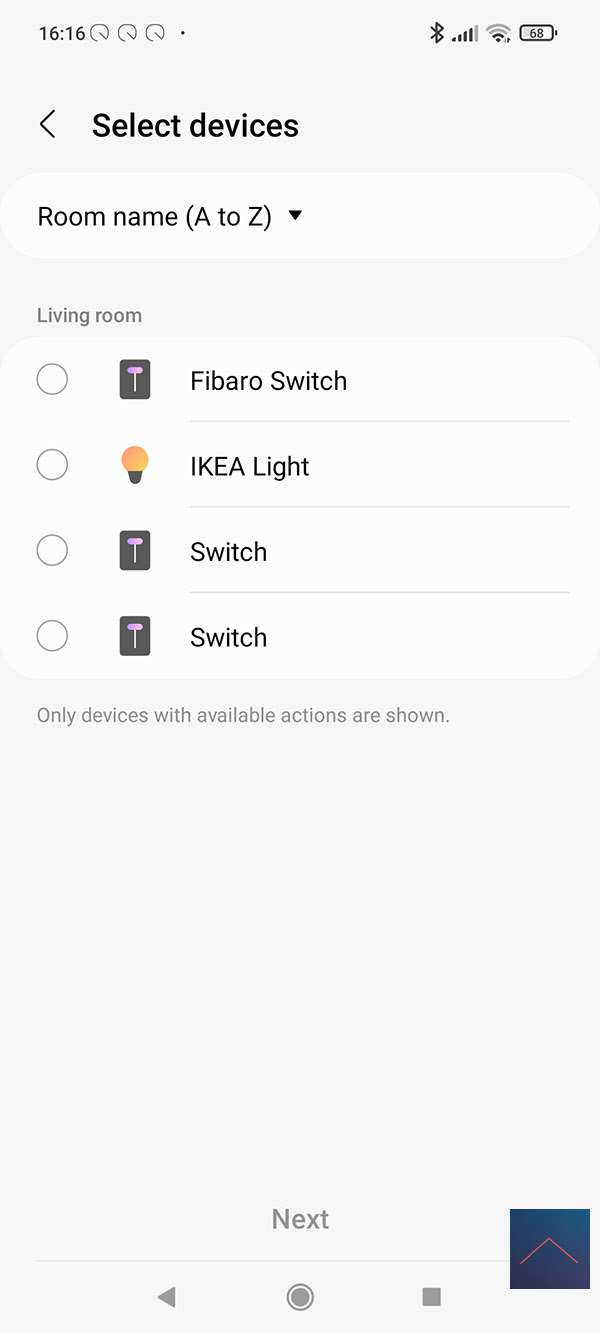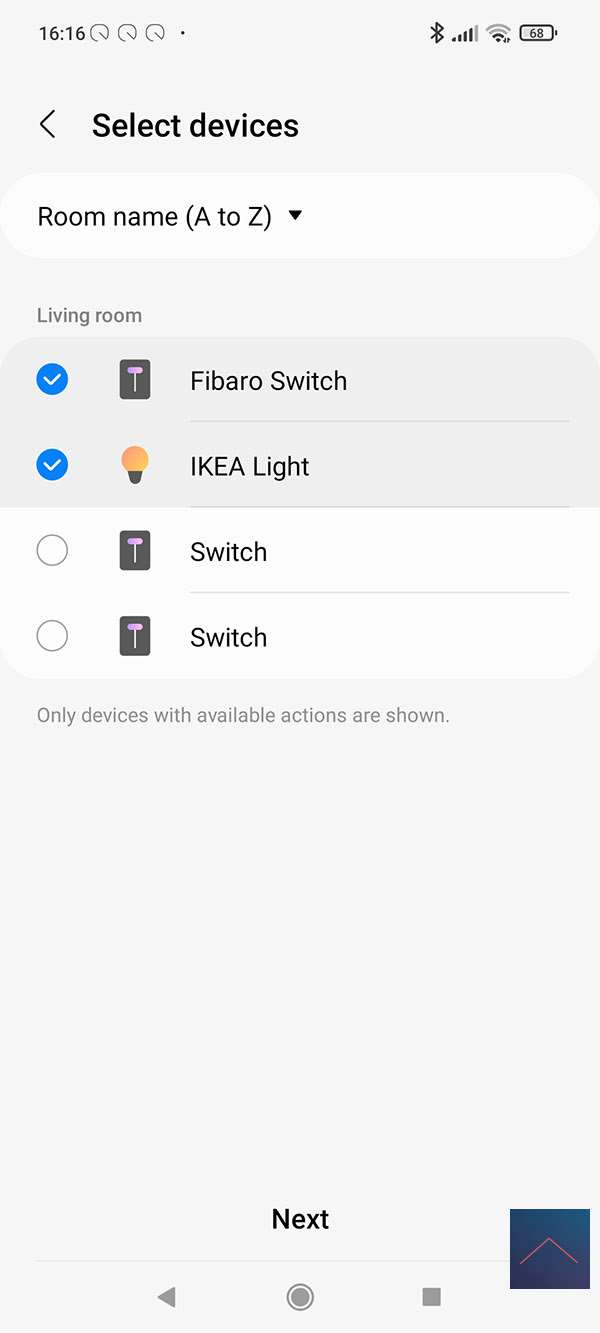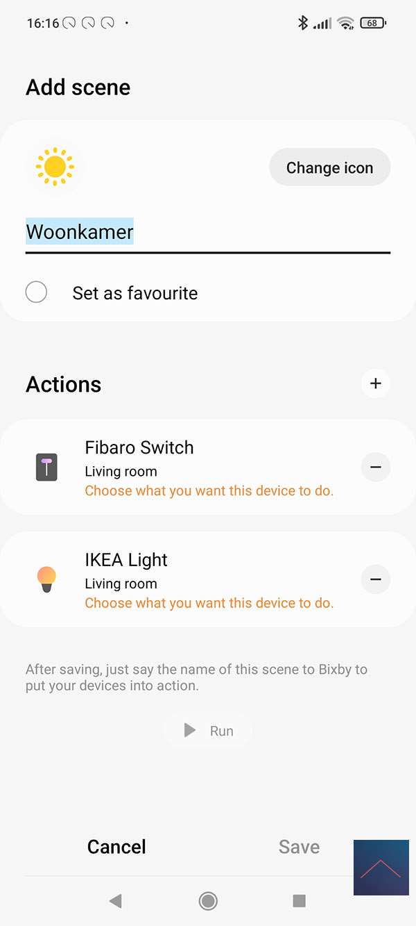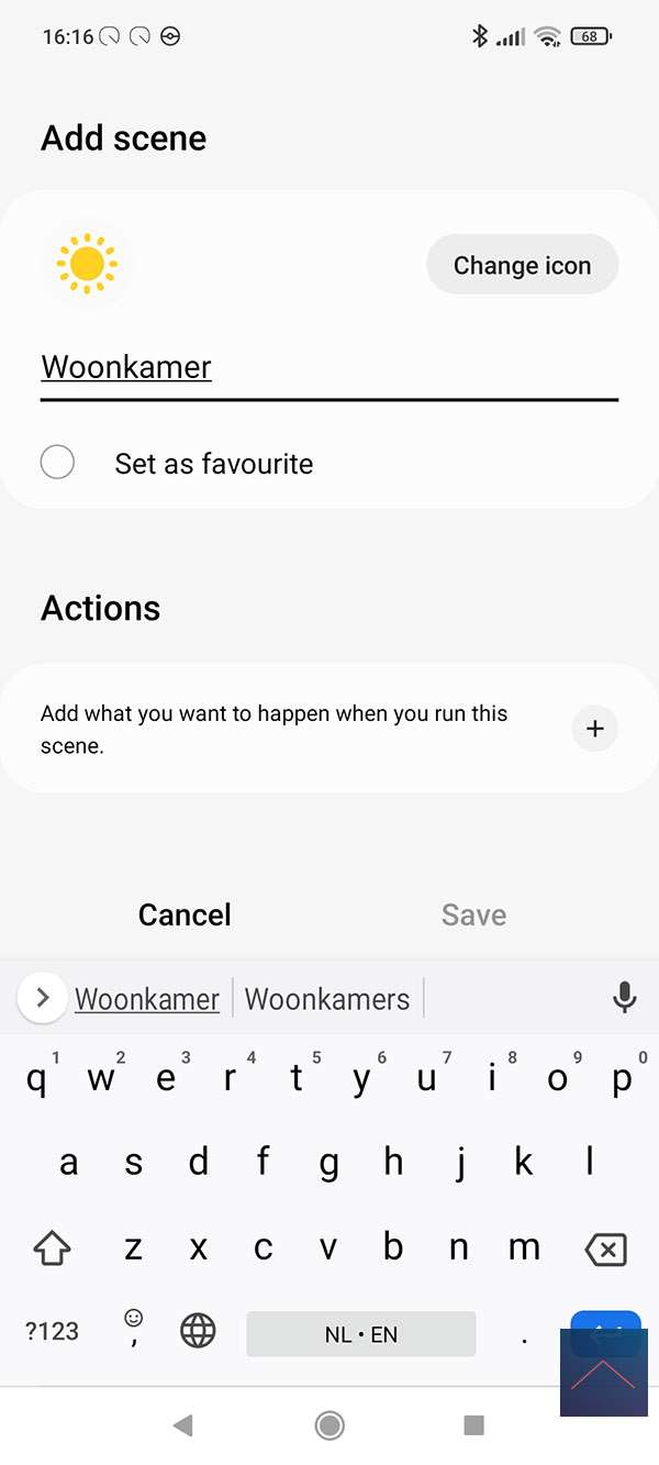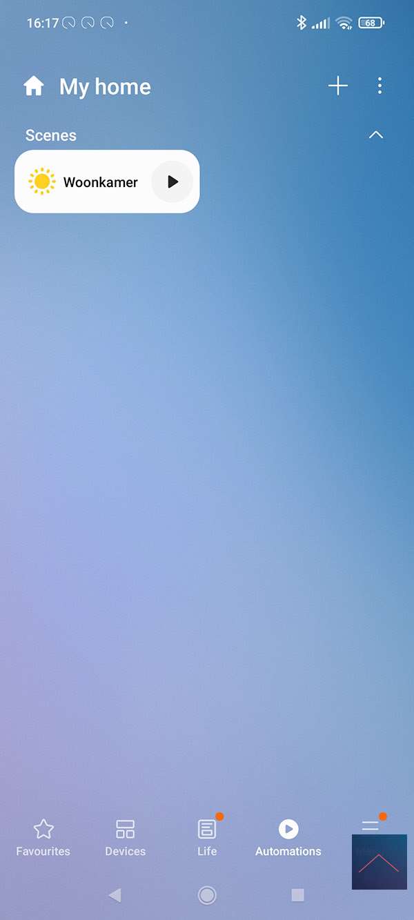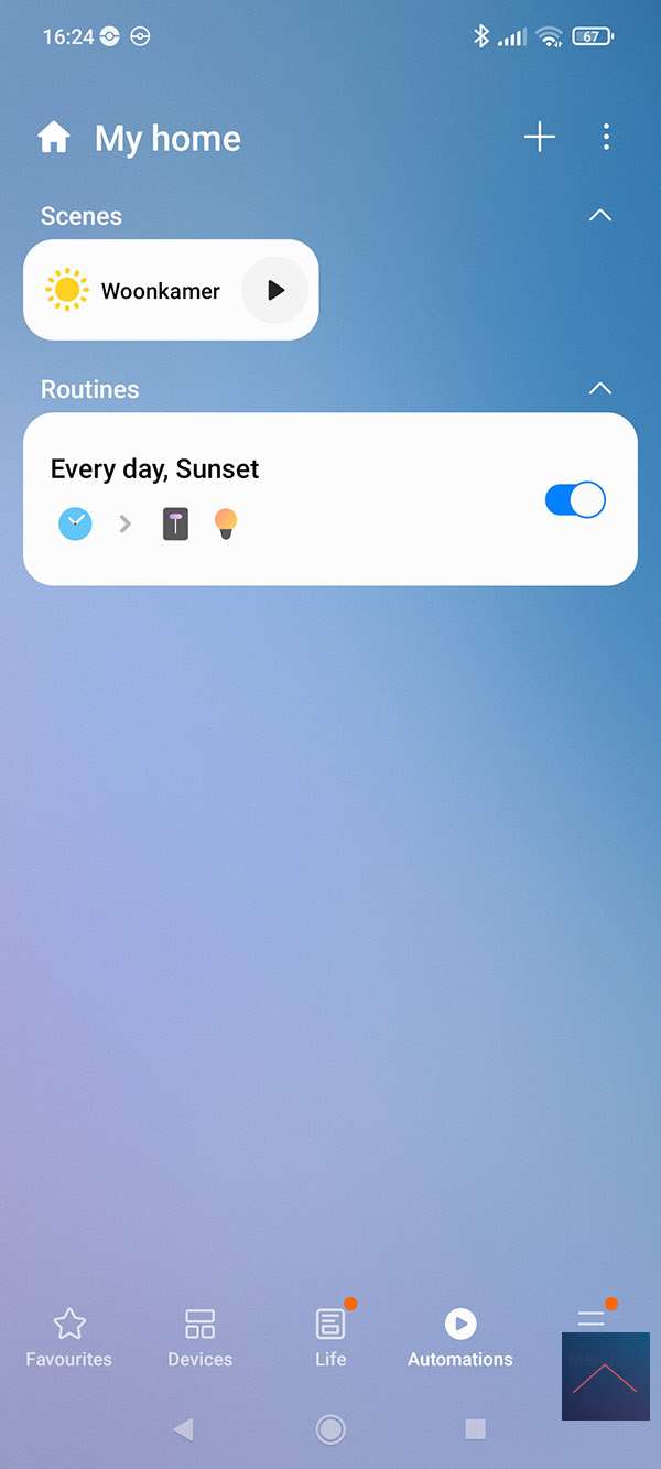 Er zijn 2 mogelijkheden om te automatiseren en dat zijn scenes en routines. Met een scene kun je verschillende apparaten aan elkaar koppelen. Denk hierbij bv aan dat je alle lampen in je woonkamer aan een scene koppelt.