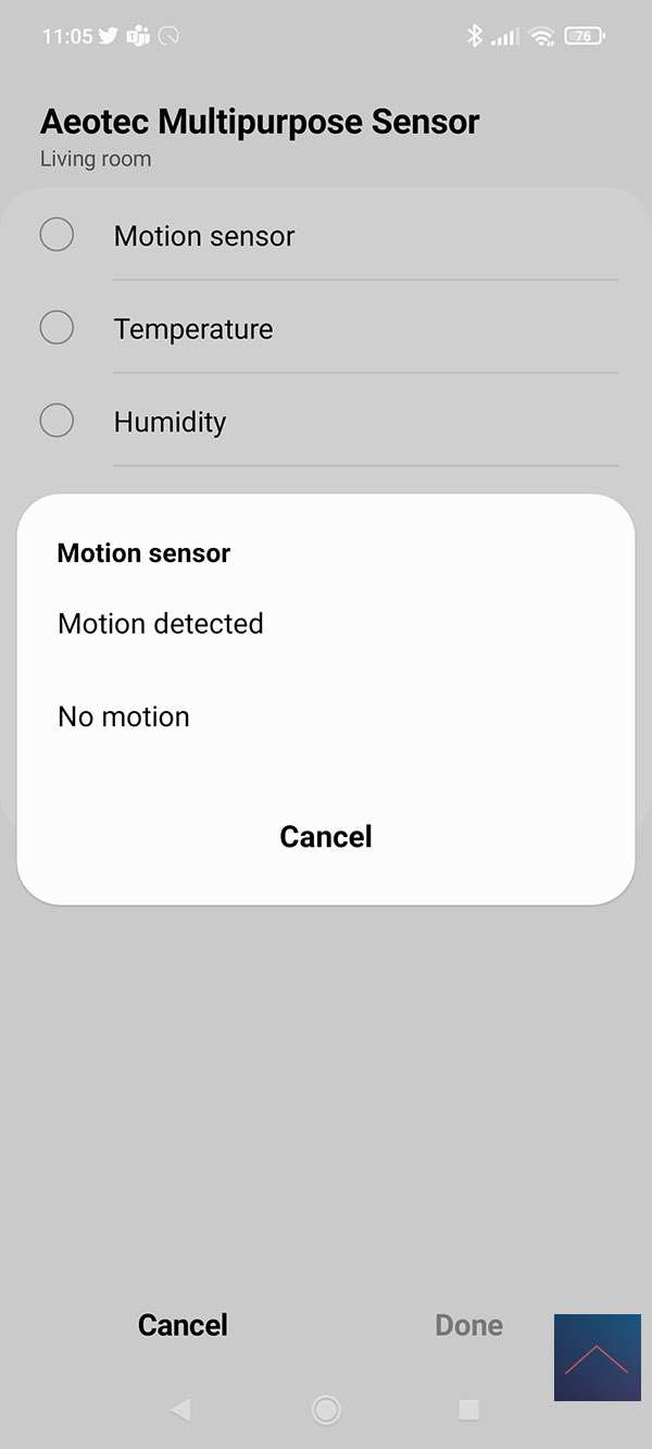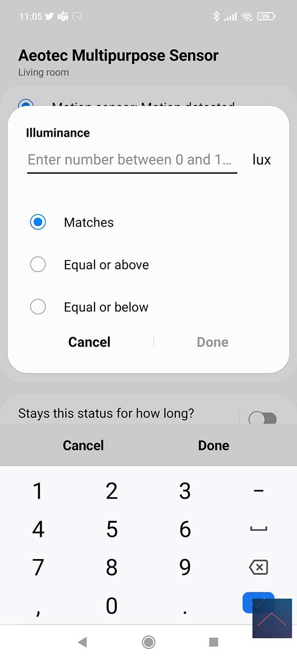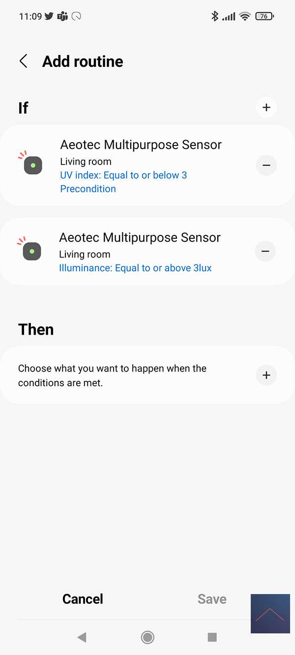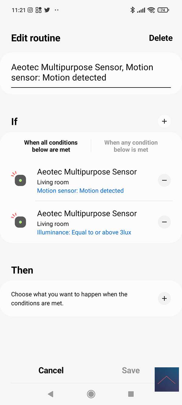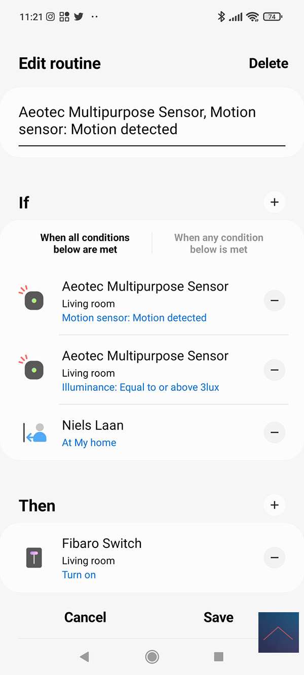 Hiervoor gebruiken we de Aeotec Multisensor, de Fibaro Singel Switch 2 en de locatie mogelijkheid in de Smartthings APP. En als bonus: dat de lamp alleen aan mag als de lux waarde onder de 3 is. Het is namelijk donker in huis.