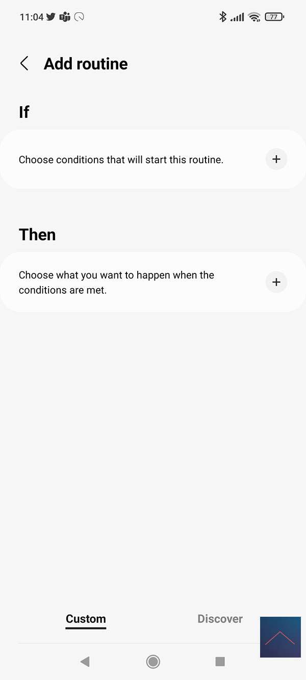 We gaan nu aan de slag met de routines om de wat complexere zaken te automatiseren. We klikken op het plusje bovenin en selecteren "routine". Nu krijgen we 2 rijen te zien: eentje met "If "voor de triggers en 1 met "Then" voor wat hij moet gaan doen.