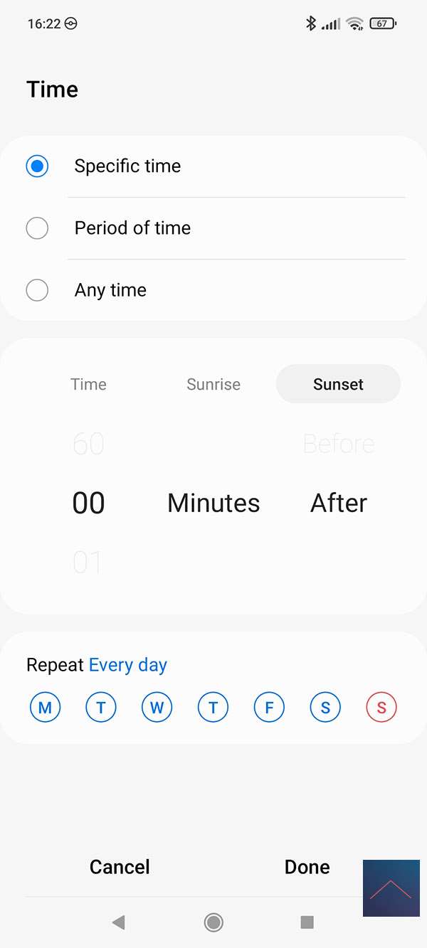 We klikken op het plusje bij de "If "en selecteren "time" en dan "specific time" hierna kunnen we kiezen voor sunset en eventueel een voor en na tijd geven. Je kunt ook nog kiezen voor bepaalde dagen of alle dagen.