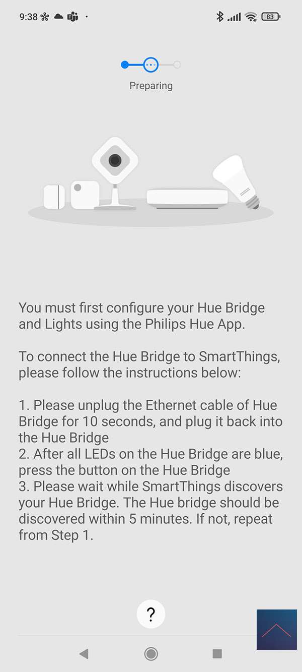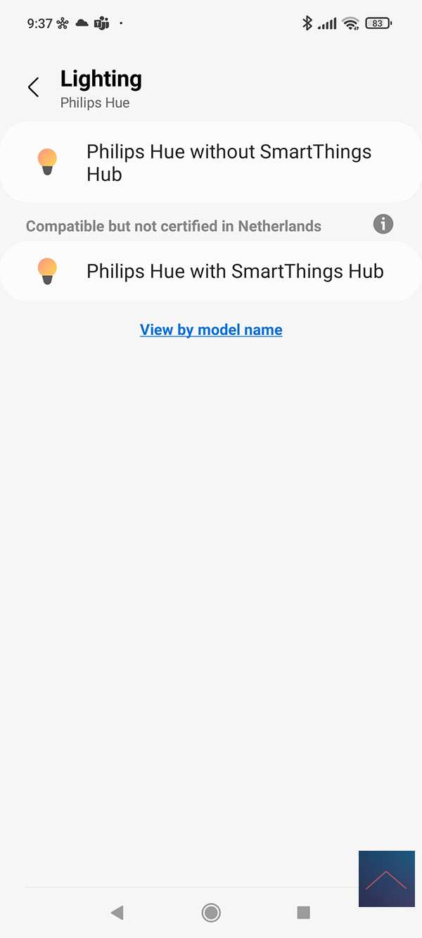 We gaan weer naar apparaten en klikken op het plusje en zoeken op Philips, drukken op "lampen" en "toevoegen" via de hub. Nu moeten we even de netwerkkabel uit de Philips Hub halen en vervolgens weer aansluiten. Nu zal de hub opnieuw verbinden en moeten we wachten tot alle lampjes blauw zijn. Als dit het geval is drukken we op de knop van de Philips Hub, we zien vrijwel direct dat hij gevonden wordt door de Smartthings hub.