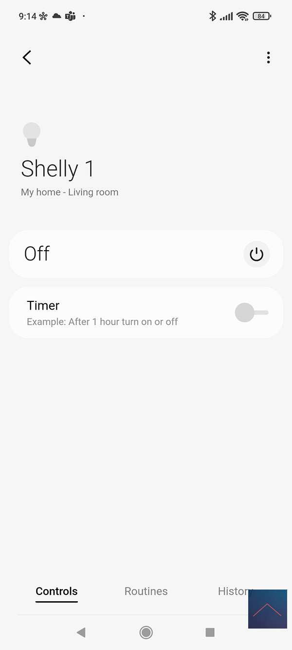 We krijgen een aan/uit schakelaar. In de Shelly APP zien we ook het stroomverbruik dit is in de Smartthings APP niet het geval. Dat is jammer.