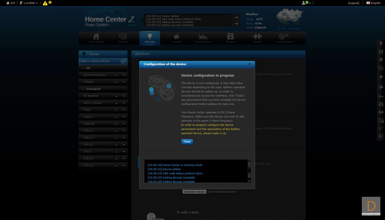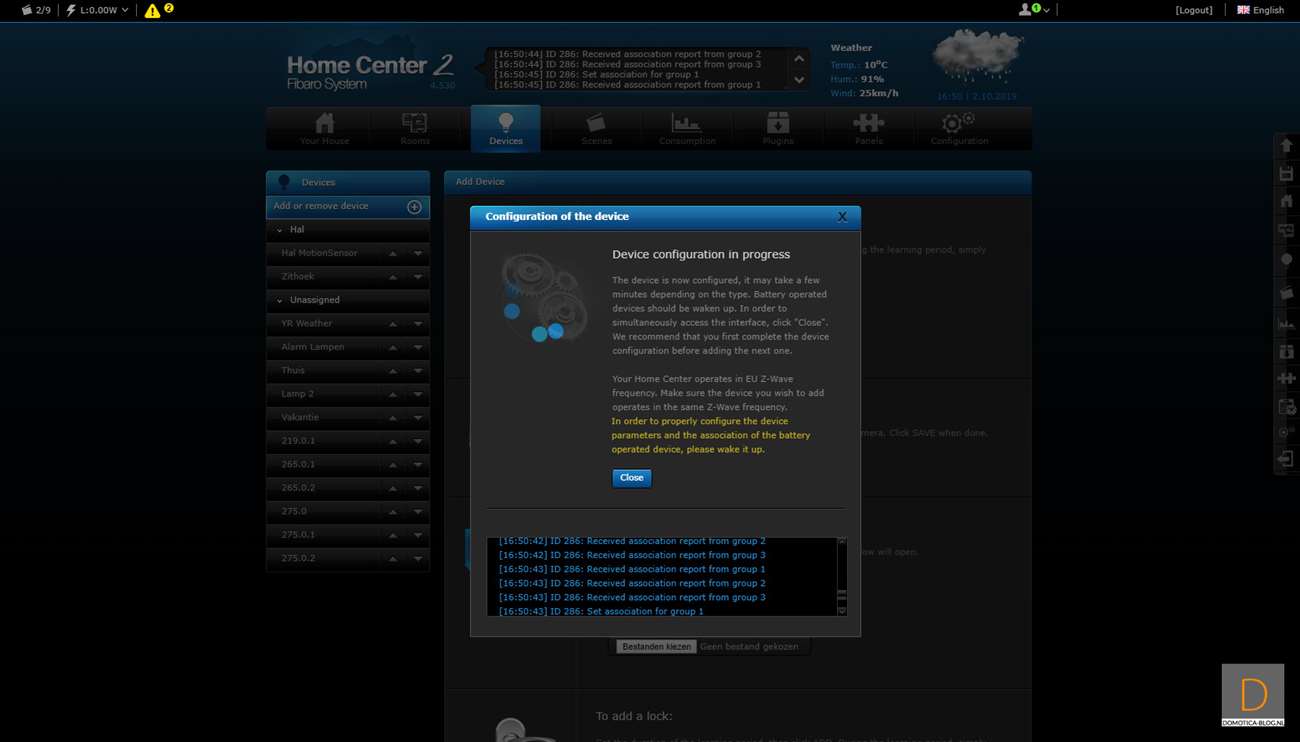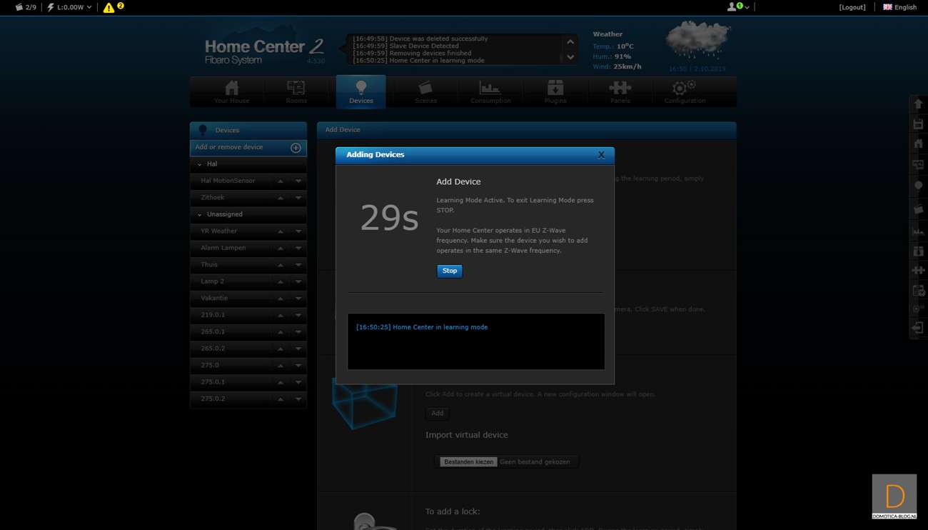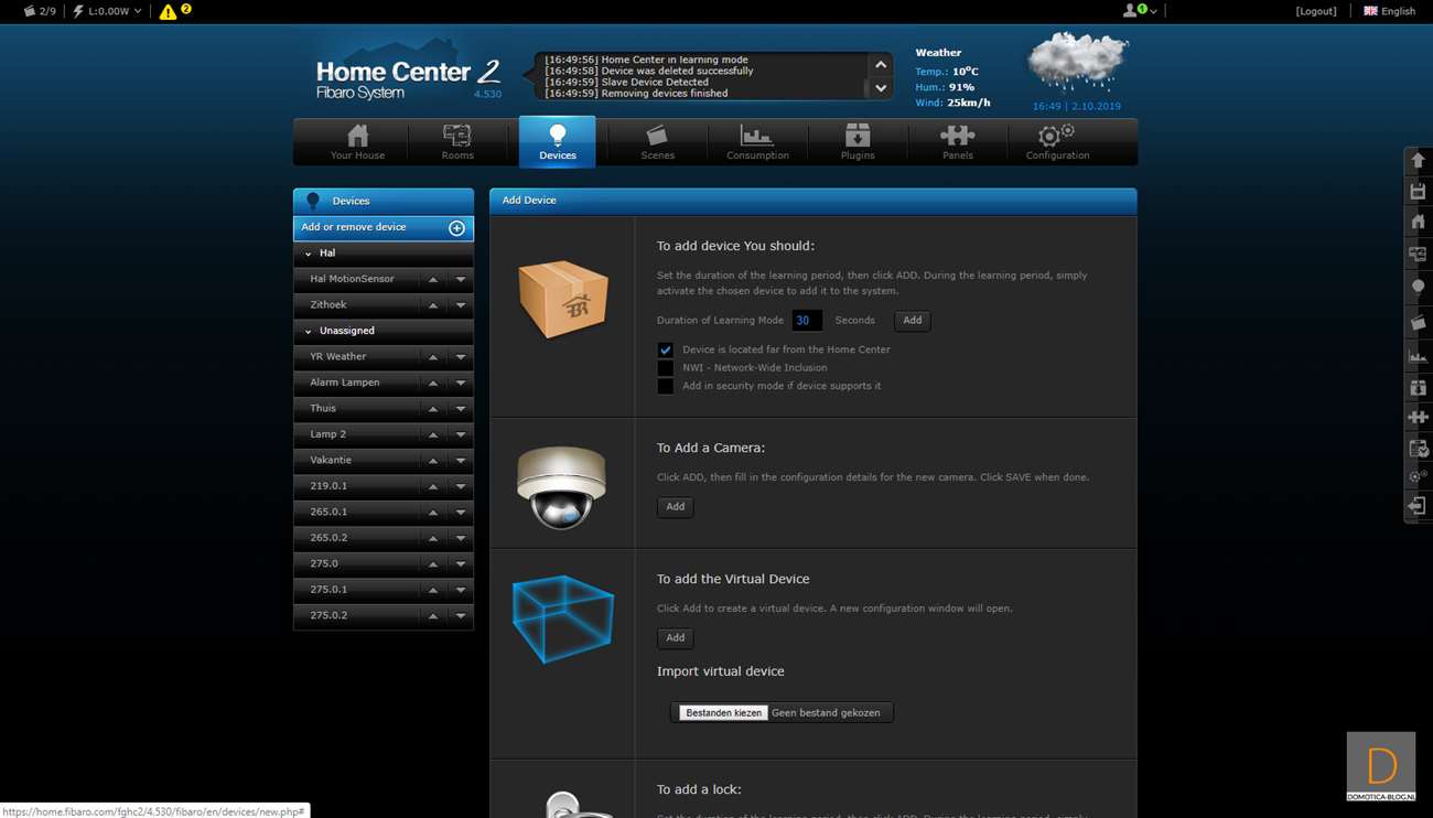 Meestal zijn de HC2 en Aeotec wel goede vriendjes, dus het toevoegen van deze remote moet wel lukken. Je haalt eerst de cover van de achterkant af. Hierdoor zal hij van stroom voorzien worden en zal hij in het toevoegen modus gezet worden. Hierna log in je op de HC2 en ga je naar je apparaten en druk je op "add". De remote werd toegevoegd en ik zie een bevestiging doordat de LED van de Wallmote oplicht. Mocht dit trouwens niet lukken, dan kun je 1 keer op het knopje aan de achterkant drukken om het toevoegen te starten.