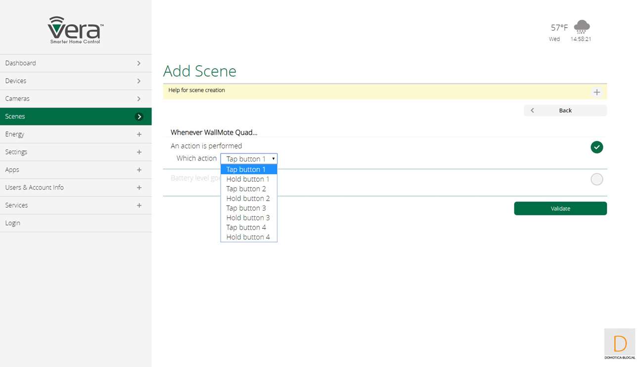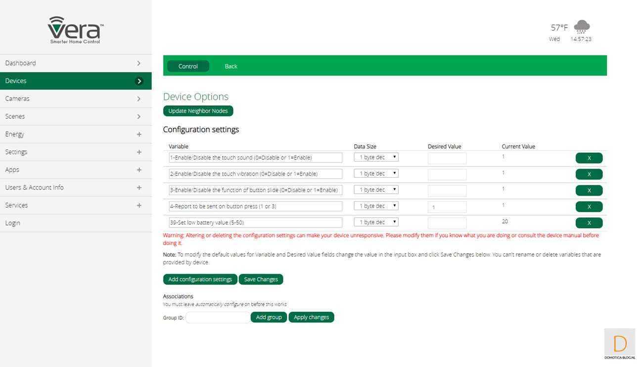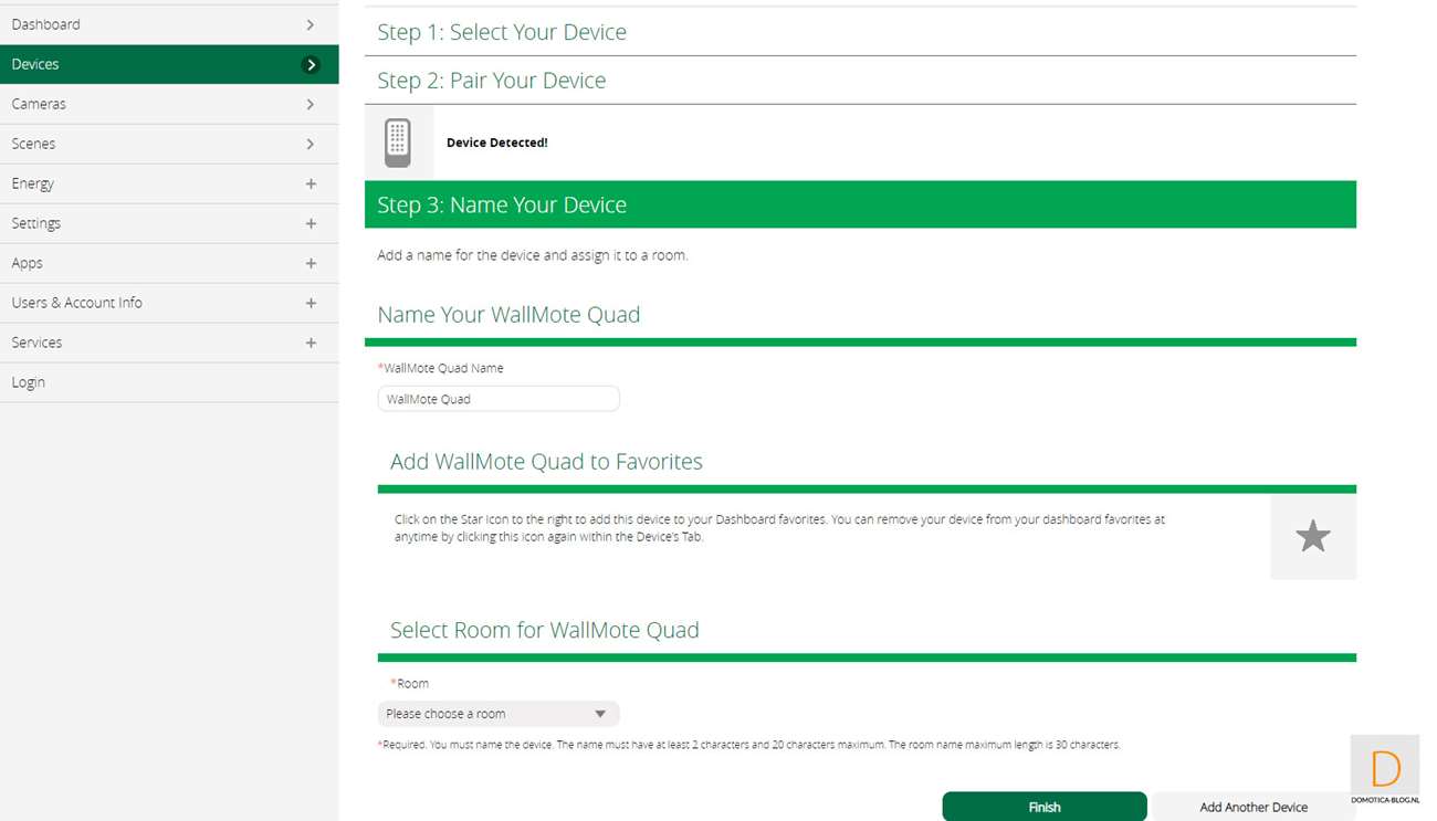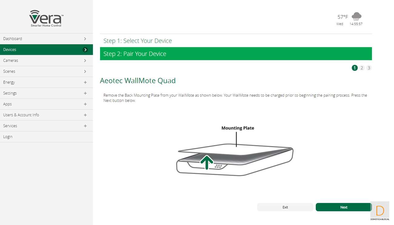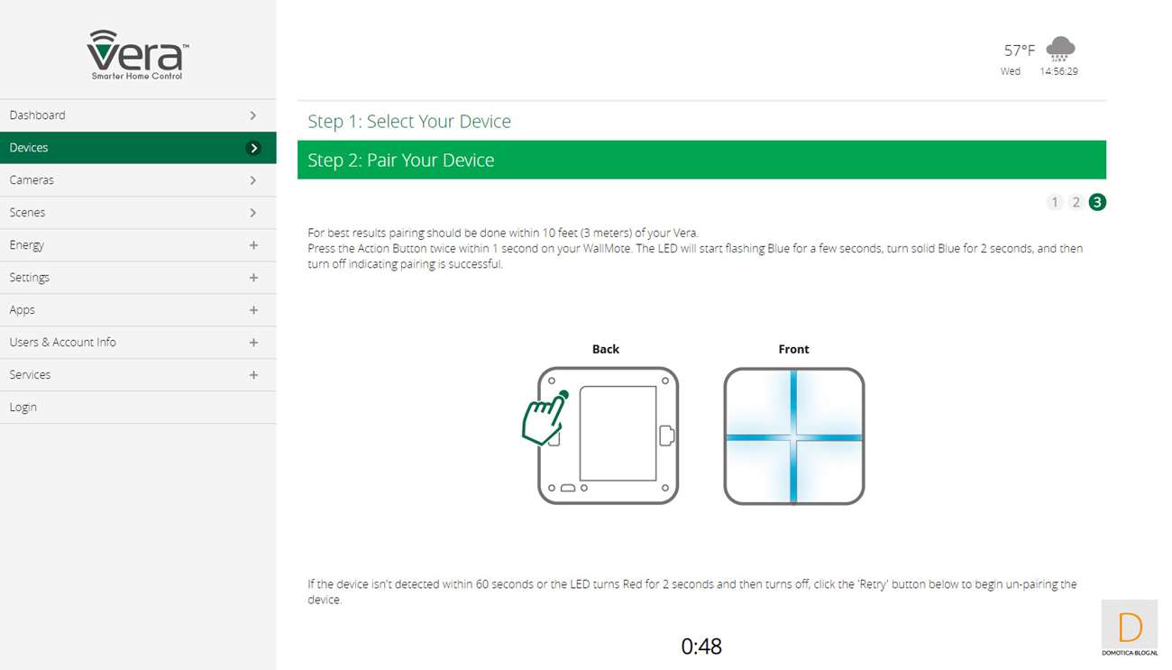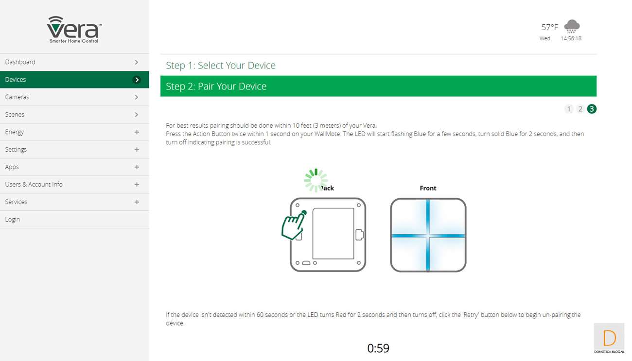 Zoals gebruikelijk testen wij deze Wallmote ook op de Vera Plus. De eerste stap is dat je de cover aan de achterkant verwijderd. Vervolgens log ik in bij de Vera en ga naar mijn apparaten en zoek daar de Wallmote op. Hij werd zomaar ineens gevonden. Dit is best bijzonder want dit is niet vaak het geval bij de Vera. Er wordt duidelijk uitgelegd wat je moet doen. Bij mij werd hij direct toegevoegd en ik hoefde geen extra handelingen uit te voeren. Hij bevestigt trouwens dat het toevoegen is gelukt doordat de afstandsbediening groen oplicht. Mocht dit trouwens niet lukken, dan kun je 1 keer op het knopje aan de achterkant drukken om het toevoegen te starten.