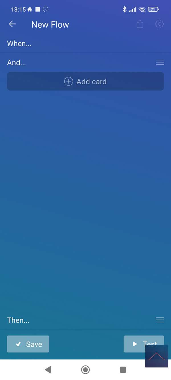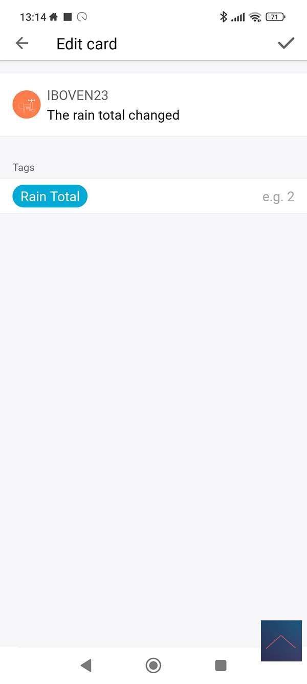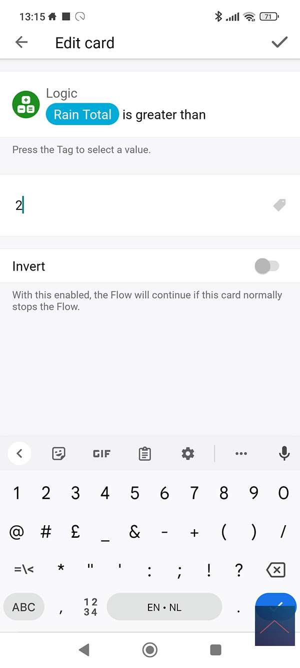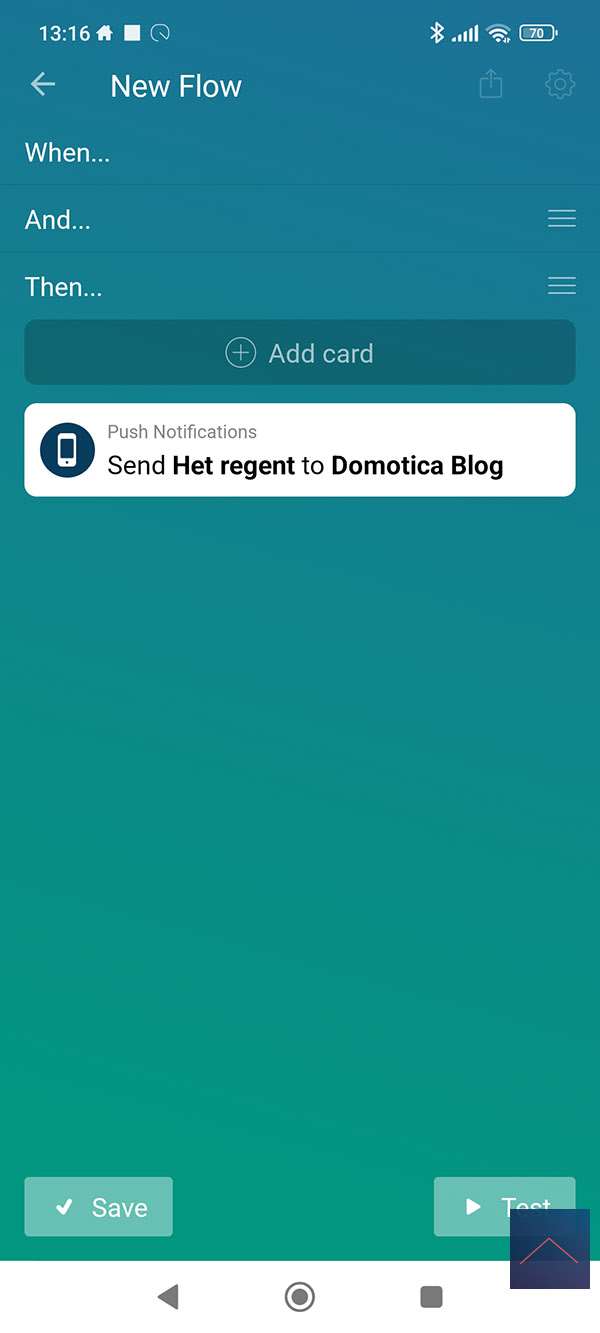 We maken een flow waarbij, als het regent, we een notificatie ontvangen. Hiervoor gebruiken we het kaartje "regen totaal" en bepalen de hoeveelheid regen en sturen we een notificatie.
