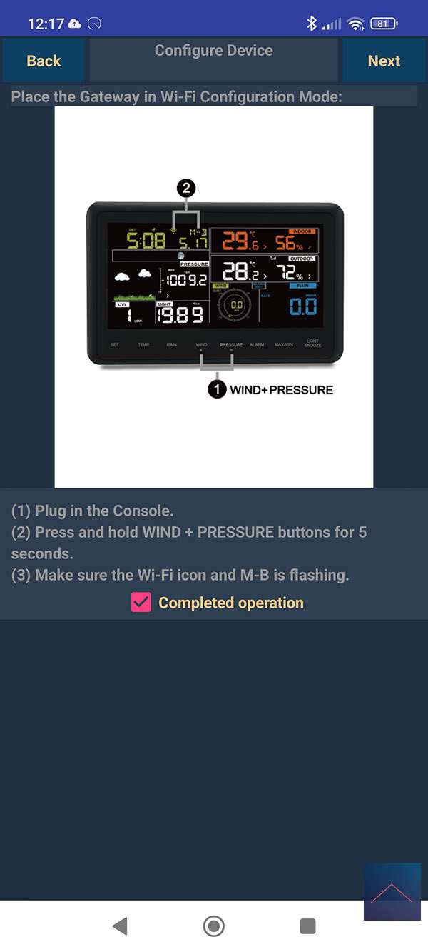 Nu moeten we de WSView APP gaan downloaden deze is er voor iOS en Android. Nadat wat toestemmingen en stappen kom je in het openingsscherm, waarna we op next drukken. We selecteren vervolgens de WS-5500 (zorg dat deze aan staat). Nu moeten we een hotspot maken van de WS-5500. Dit kun je doen door de 5 seconden lang de WIND en PRESSURE te gelijk in te drukken. Het WiFi icoon zal dan gaan knipperen met de tekst M-B. Klik hierna op next.