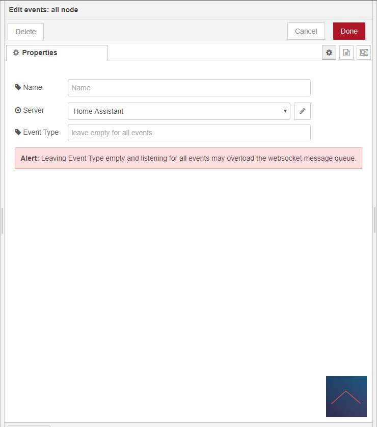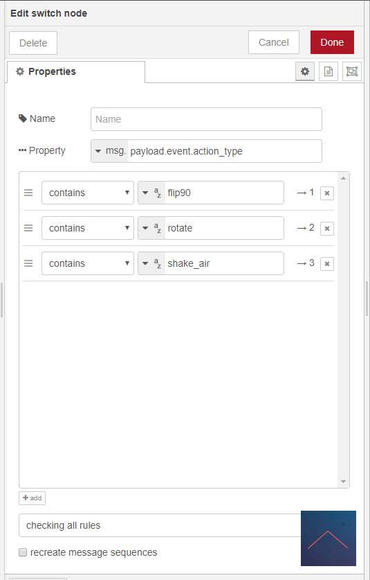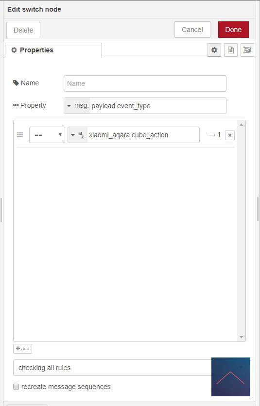 Om wat te triggeren via de cube is maak ik gebruik van de "all events" node. Hiermee registreer je alle inkomende commando's. Wij willen natuurlijk alleen die van die cube dus gebruik ik een switch om dit af te vangen. Vervolgens gebruik ik nog een switch om de events door te sturen (shock, rotate, flip90, etc). En als laatste zet ik de lamp aan.