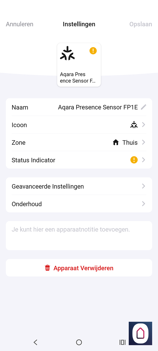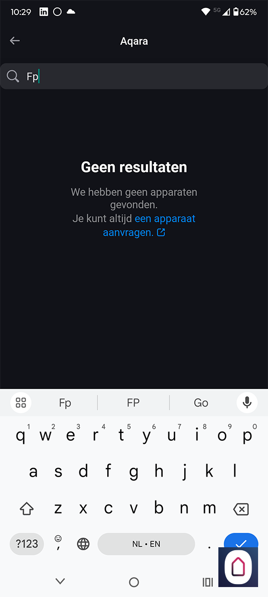 Laten we even gaan proberen via Zigbee. We starten de Homey APP op en gaan naar onze apparaten en de drukken op het plusje rechtsboven. We selecteren nieuw apparaat en zoeken op Aqara en vervolgens op FP1E. Helaas wordt hij niet gevonden, dus hij is nog niet toegevoegd aan de apparaten database van de Homey. Dat is jammer.
