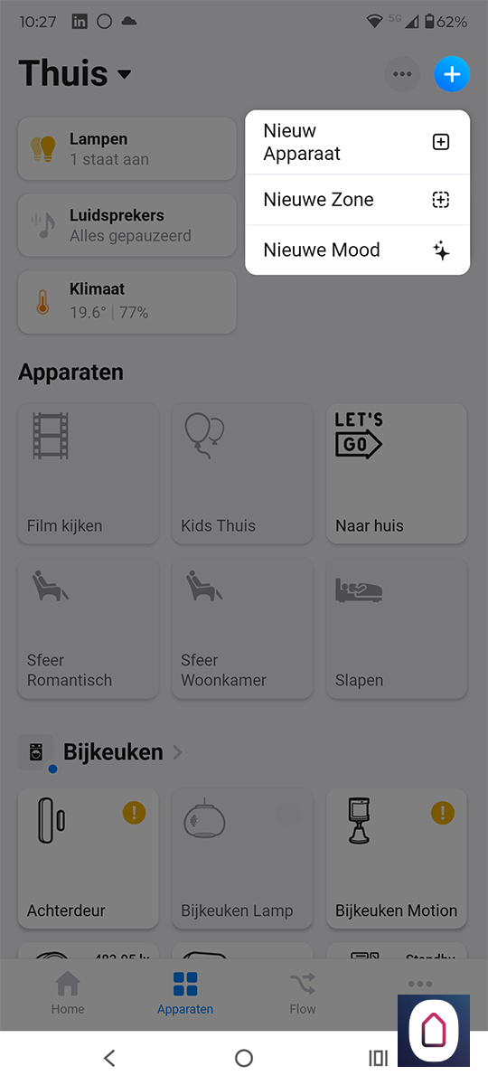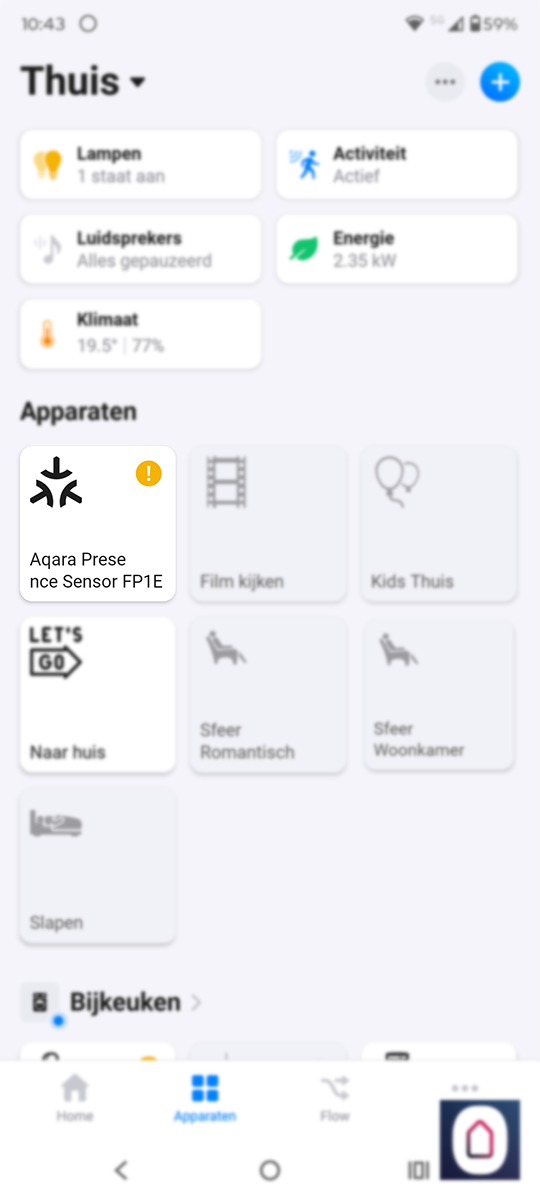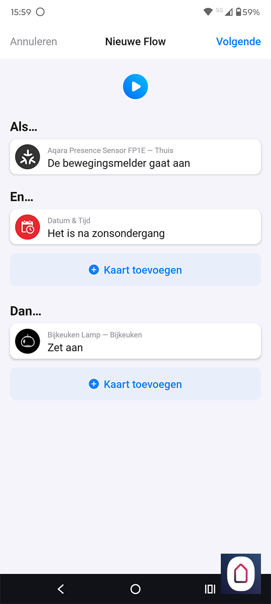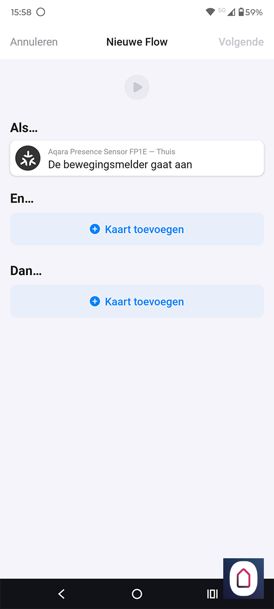 De flow werkt goed en ondanks dat hij via de Aqara hub moet, merken we dat de sensor snel reageert.