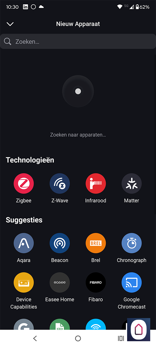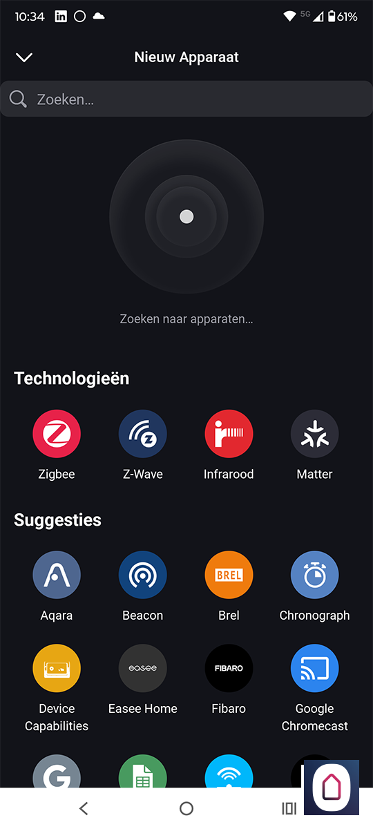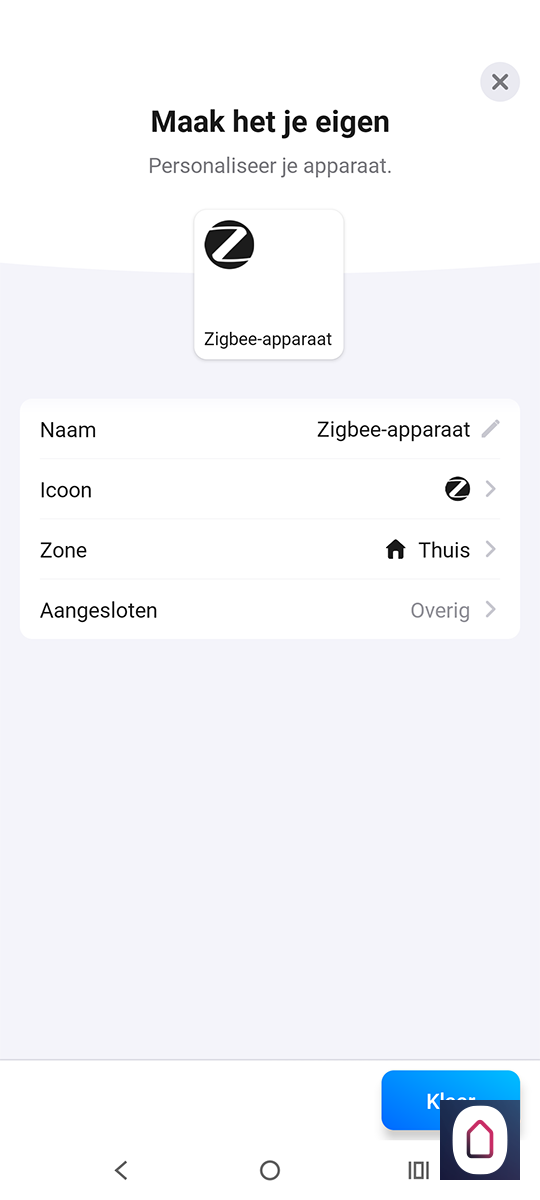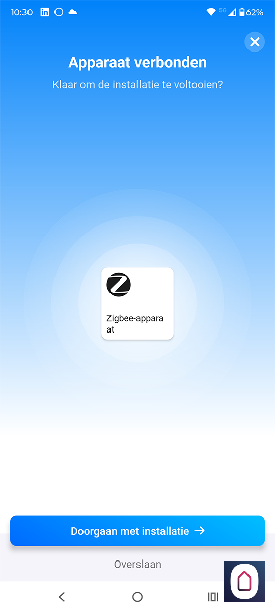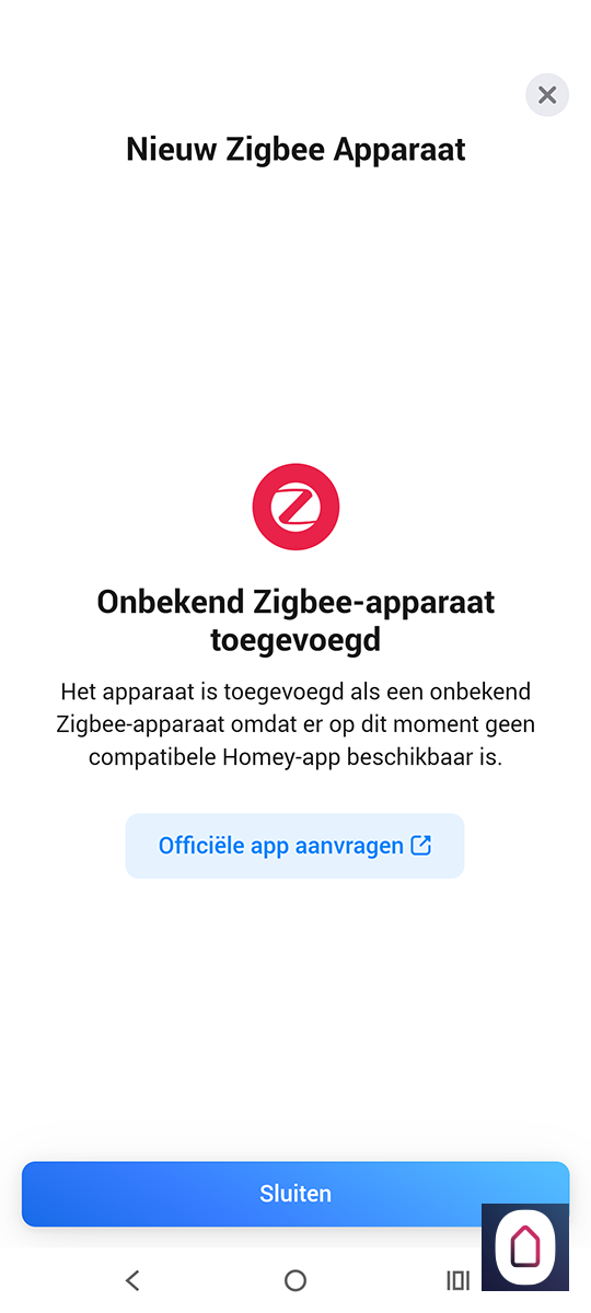 Wat we nog kunnen proberen is hem als een algemeen Zigbee apparaat toe te voegen. Hiervoor gaan we even terug en selecteren Zigbee. Nu moeten we het knopje aan de achterkant 10 seconden ingedrukt houden. Hierdoor komt hij weer in de leerstand, de Homey vindt hem direct maar voegt hem toe als een schakelaar. Dus dat gaat helaas niet werken.