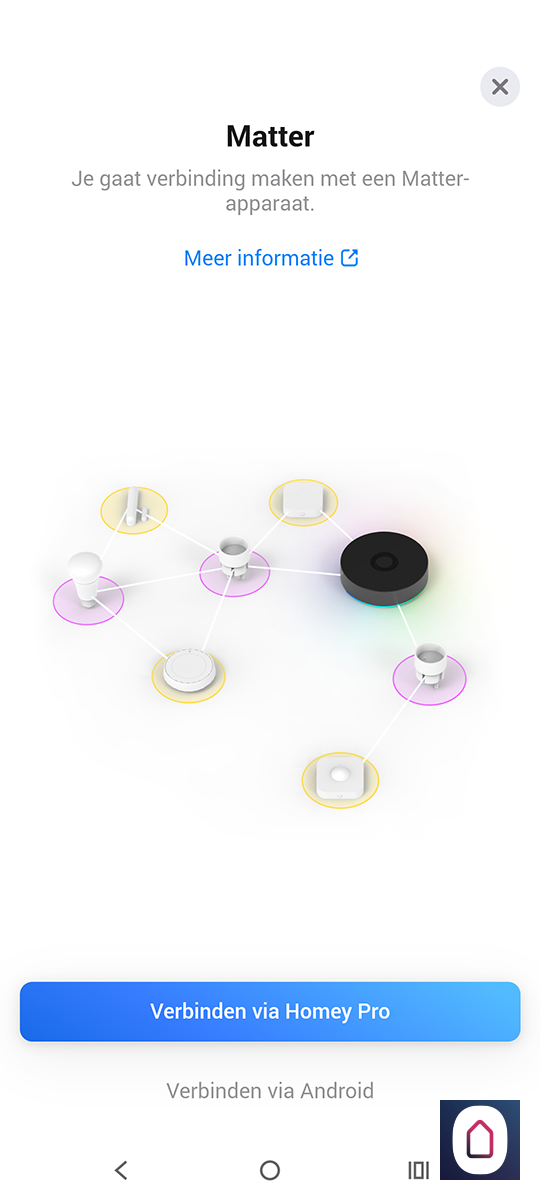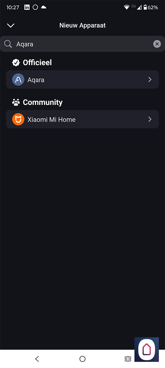 Omdat we de Aqara HUB hebben kunnen we hem ook nog op een andere manier gaan toevoegen aan de Homey. De Homey en M3 hub hebben namelijk ondersteuning voor Matter. Dit is een standaard waarmee apparaten met elkaar kunnen communiceren. Hiervoor moeten we eerst de Aqara HUB gaan toevoegen aan de Homey.