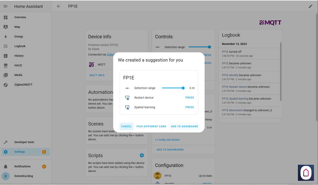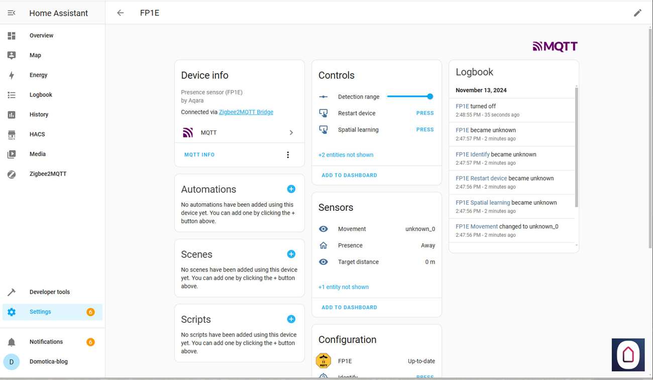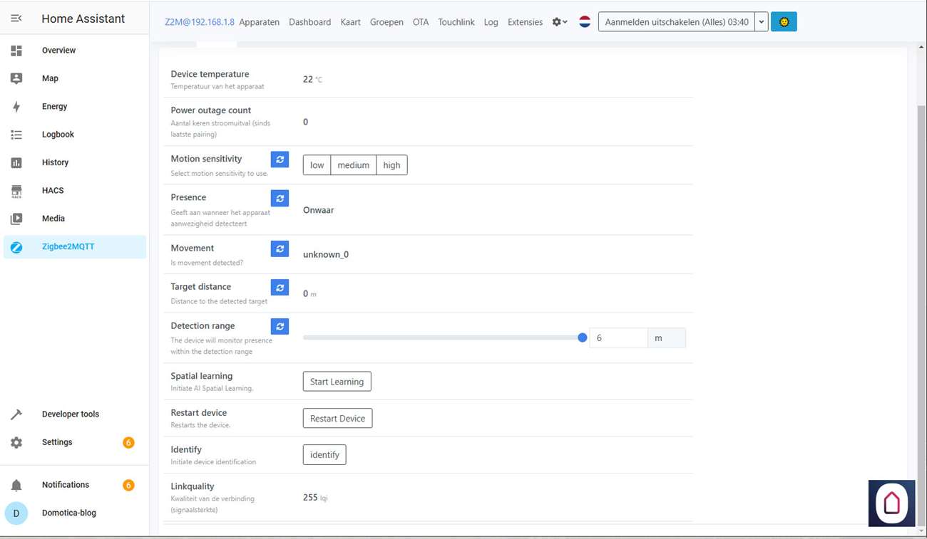 Als er wel of geen beweging is wordt zal dit zichtbaar worden in Home Assistant. Je kunt de afstand van de detectie instellen via de configuratie.