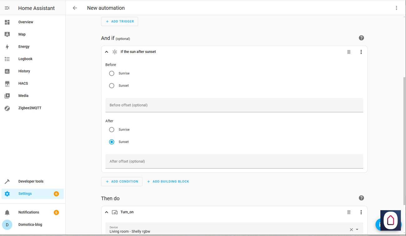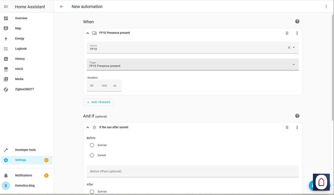We maken een automation waarbij als er beweging is en de zon is onder een lamp aangezet wordt.