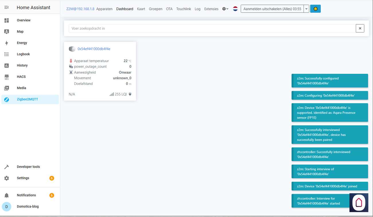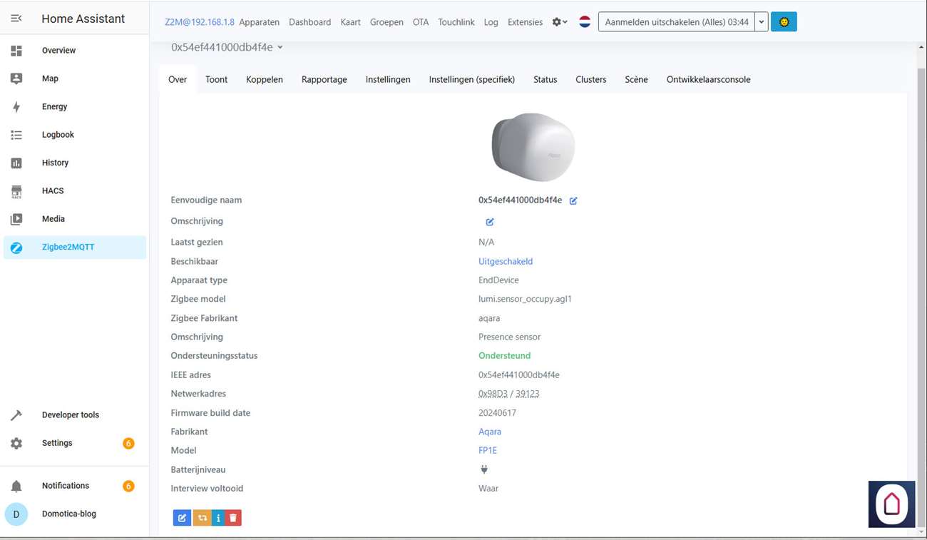 Om hem toe te voegen gebruiken we de RPI3 en de Conbee 2 USB stick en de ZigBee2MQTT integratie. Met de Deconz integratie zou deze sensor ook moeten werken maar heb dit zelf niet werkend gekregen. Nog een opmerking deze sensor werkt niet op kanaal 21 t/m 24 dus als je daar je Zigbee op ingesteld hebt zal je deze moeten wijzigen. Wat inhoud dat je al je apparaten waarschijnlijk opnieuw moet toevoegen.