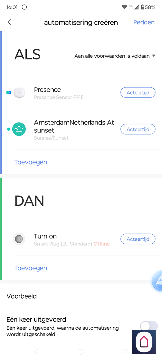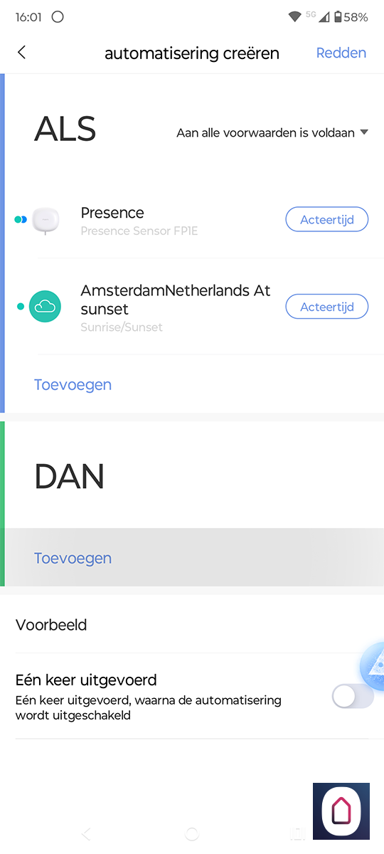 Na wachten tot de zon onder ging werkt deze automation precies zoals het hoort en reageert de sensor zeer snel.