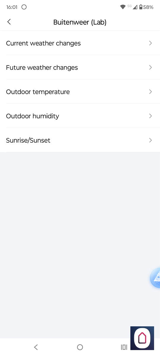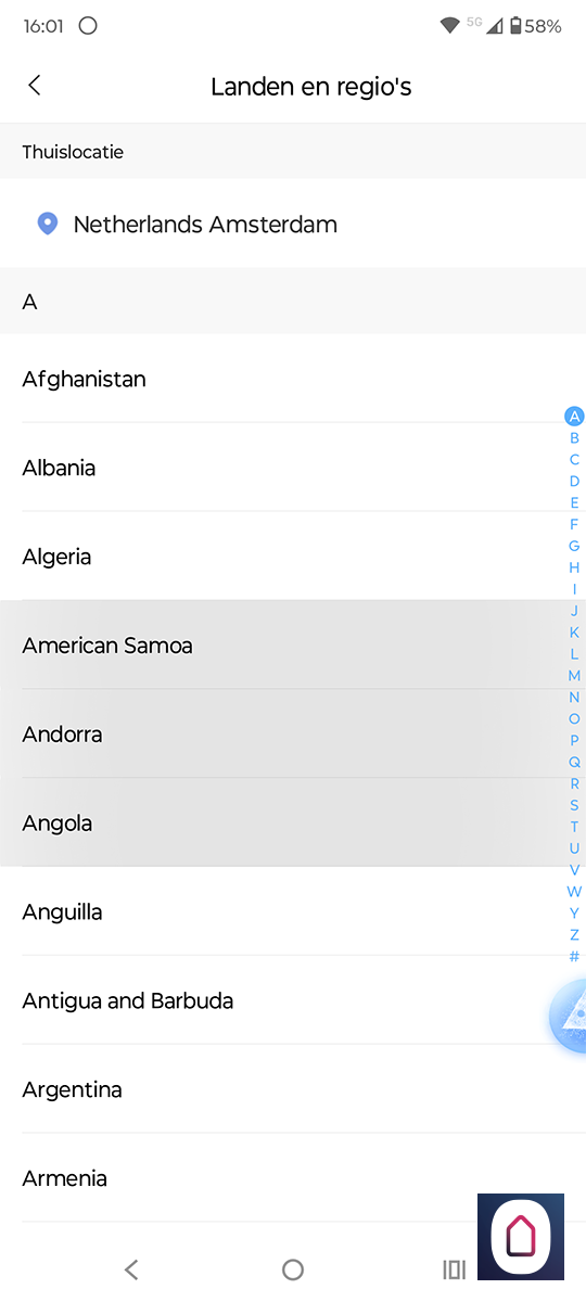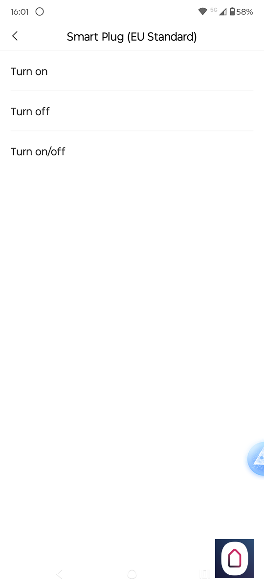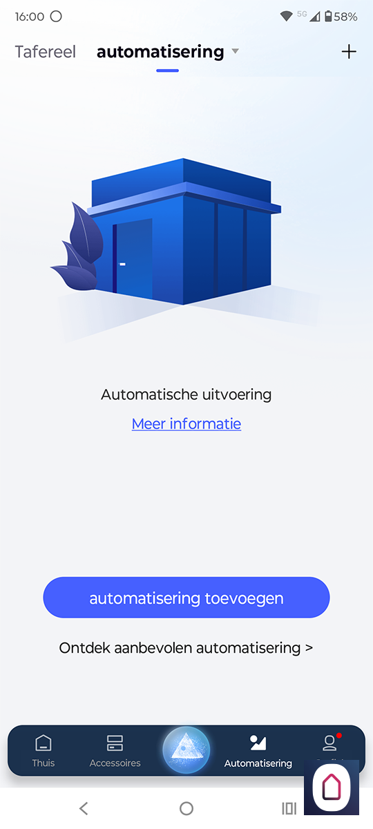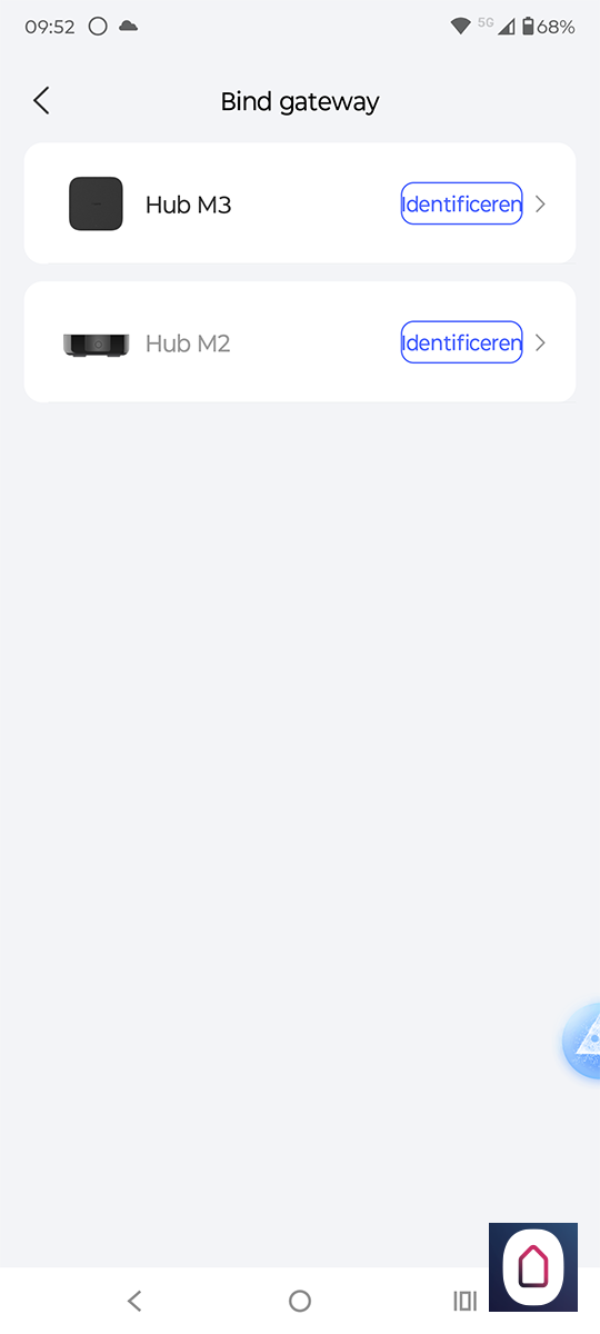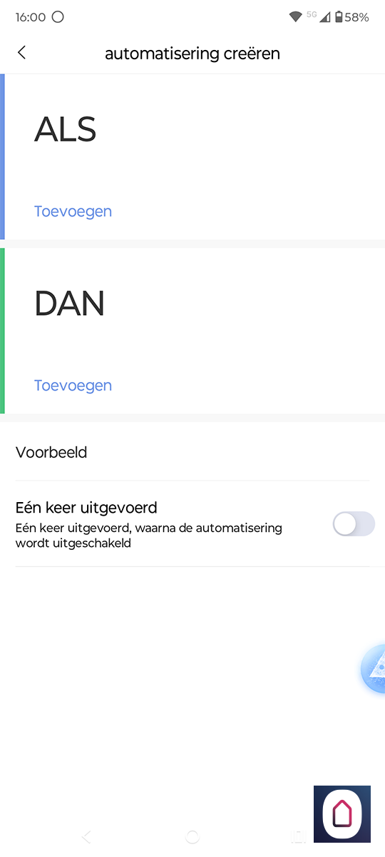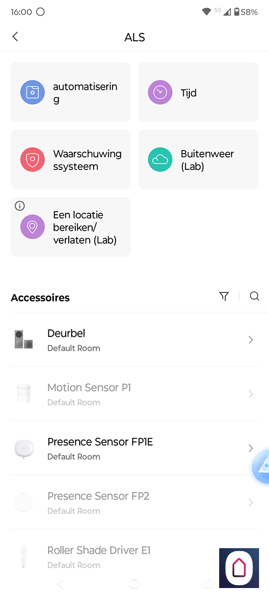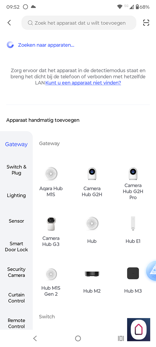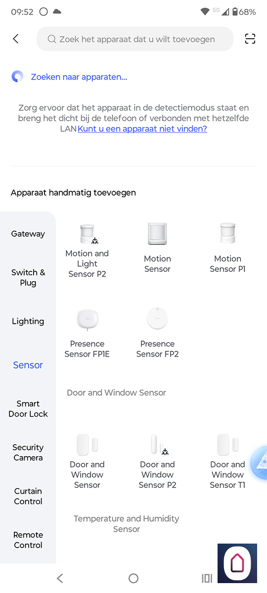 Er gebeurt niks als je de stroom er prikt maar als je de reset knop aan de achterkant 5 seconden ingedrukt houdt gaat de LED knipperen (zit ook aan de achterkant) en kunnen we hem toevoegen. Nu gaan we naar de APP en drukken op het plusje rechts boven. Nu kunnen we de code scannen of hem even opzoeken in de lijst. Na enkele seconden werd hij gevonden en zie hem bij mijn apparaten.