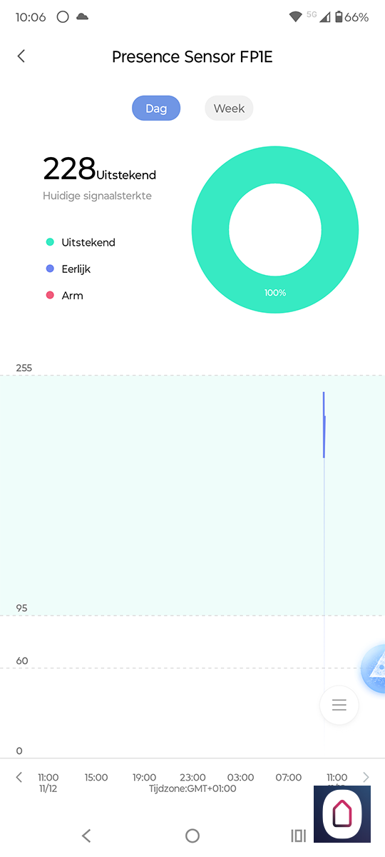 Wat ons opvalt na de installatie is dat hij beweging detecteert maar hierna direct in 'geen beweging gedetecteerd' veranderd en hier ook niet meer uit komt (terwijl ik een dansje voor de sensor doe). Je kunt via de APP even kijken of er een goede verbinding is tussen de hub en de sensor en dit is het geval, hij zegt zelf dat het signaal uitstekend is.
