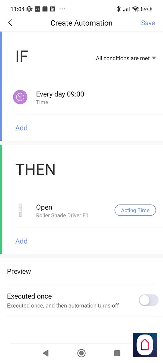 Laten we een automation maken waarbij om 09.00 de rolgordijnen open gaan. Bij de IF selecteren we de tijd en bij de THEN de rolgordijnen, appeltje eitje.