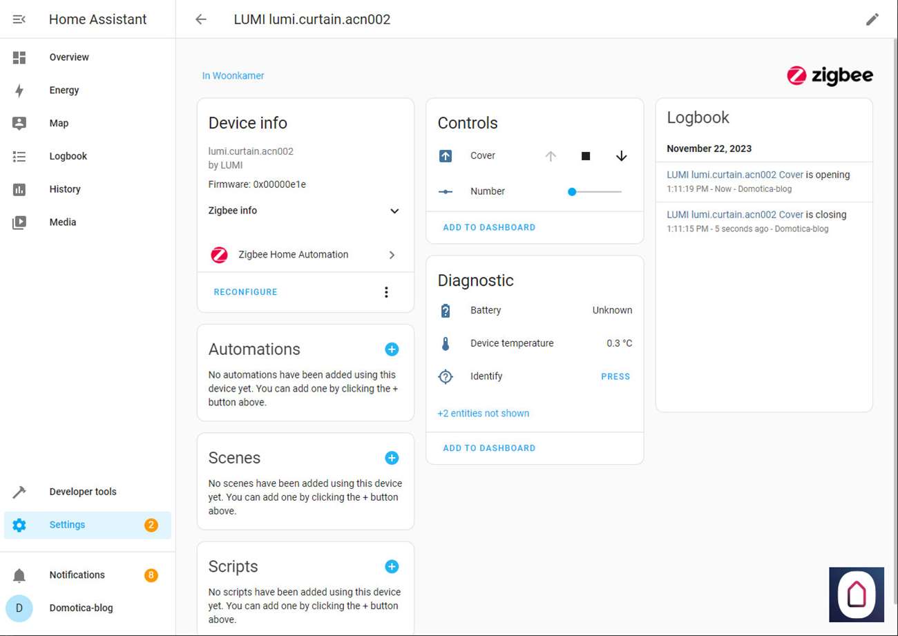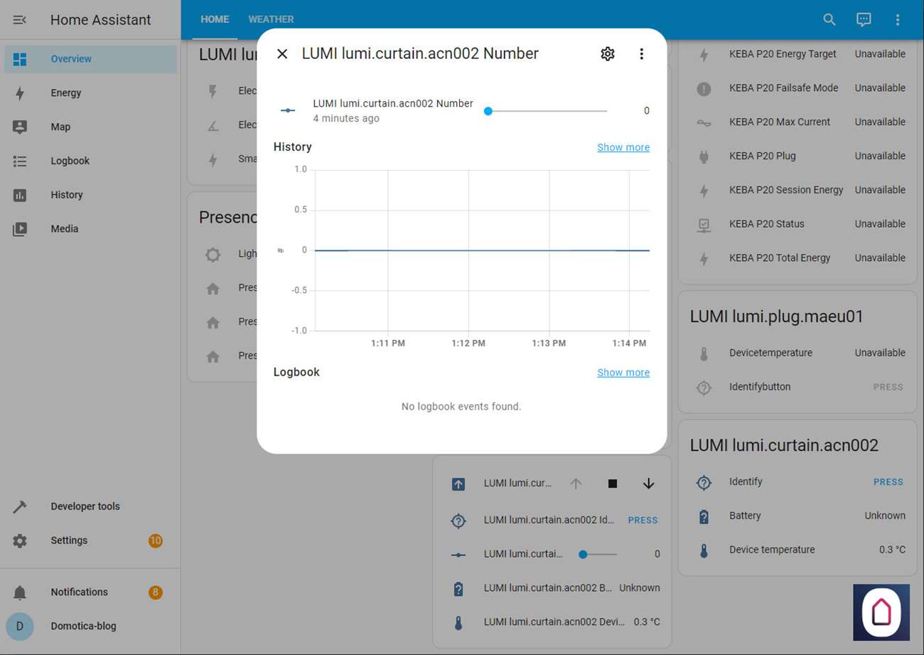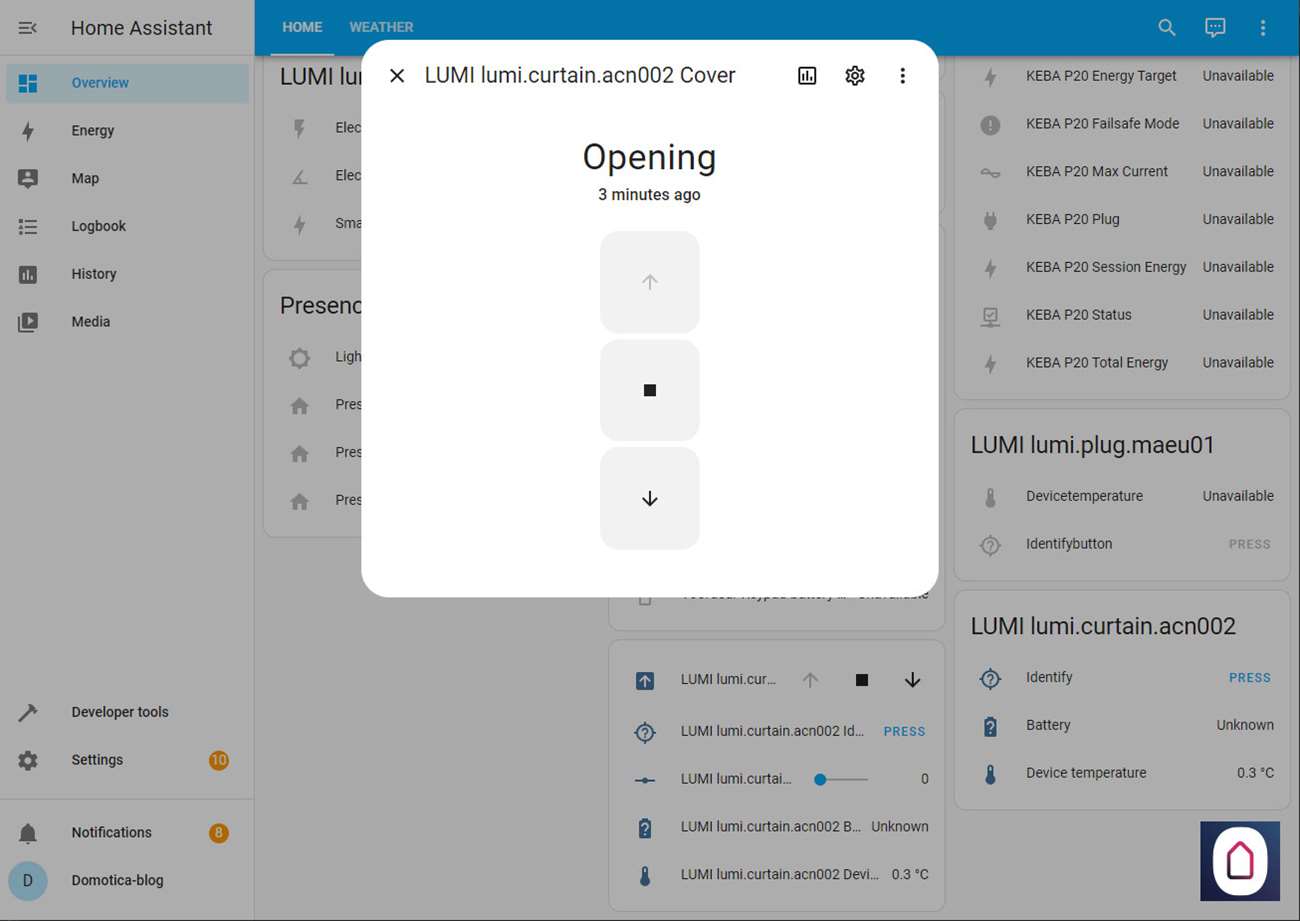 Nu we dit allemaal gedaan hebben kunnen we via de Home Assistant het gordijnen open en sluiten, en de positie bepalen (half open) en het batterijniveau zien.
