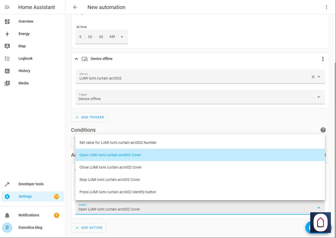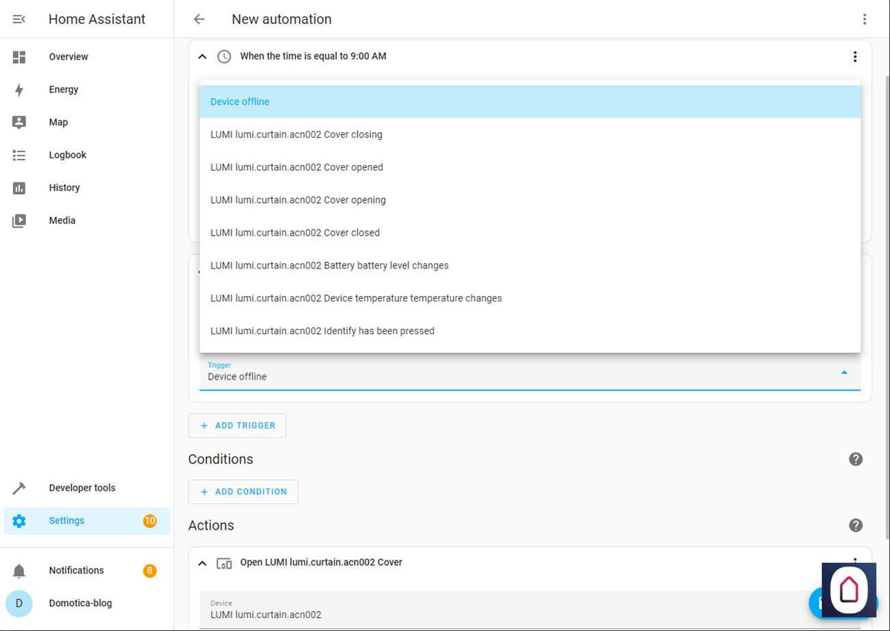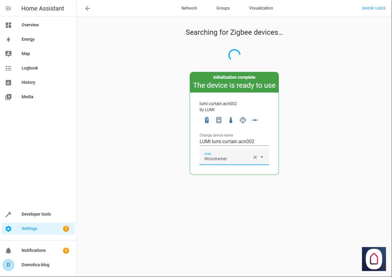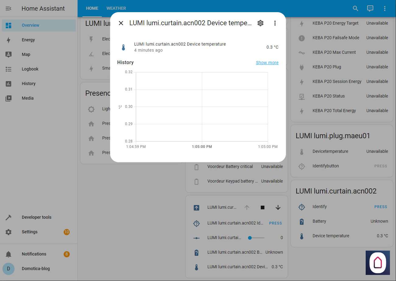 Nu we dit allemaal gedaan hebben kunnen we via de Home Assistant het gordijnen open en sluiten, en de positie bepalen (half open) en het batterijniveau zien.