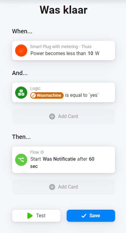 Je kunt natuurlijk verschillende toepassingen verzinnen voor deze plug. Van het simpel aan- en uitzetten tot het bijhouden van energie van een apparaat. Van deze laatste variant maken we een flow waarbij we een notificatie willen ontvangen als de wasmachine klaar is.