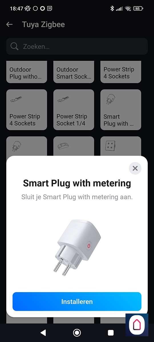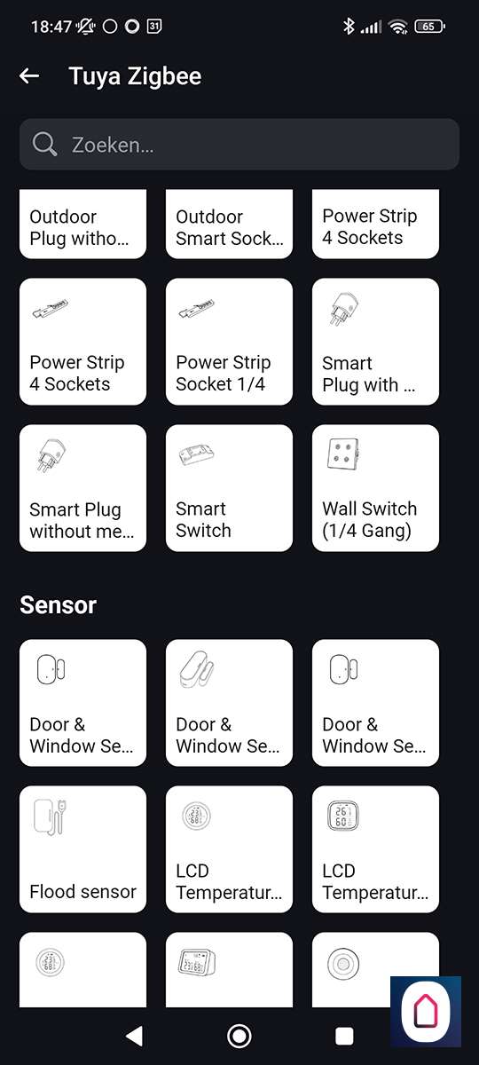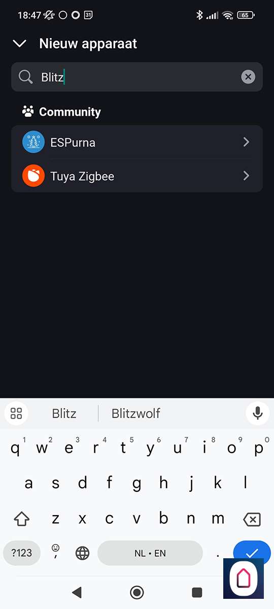 We starten de Homey APP op en gaan naar onze apparaten, we drukken vervolgens op het plusje een selecteren 'nieuw apparaat'. Nu zoeken we de BlitzWolf op, je ziet dat er resultaten komen maar het merk BlitzWolf komt niet naar voren. Dit komt omdat er geen aparte APP is maar je kunt de Tuya Zigbee APP gebruiken. Deze selecteren wij en zoeken de plug (met meter) op.