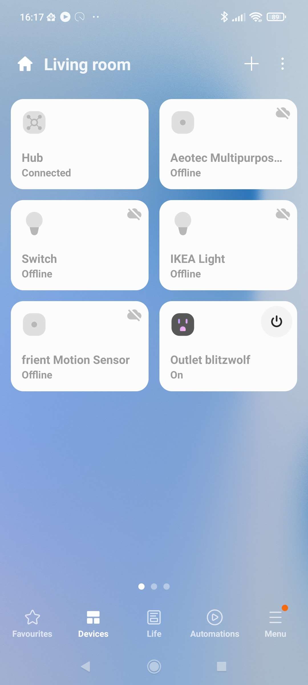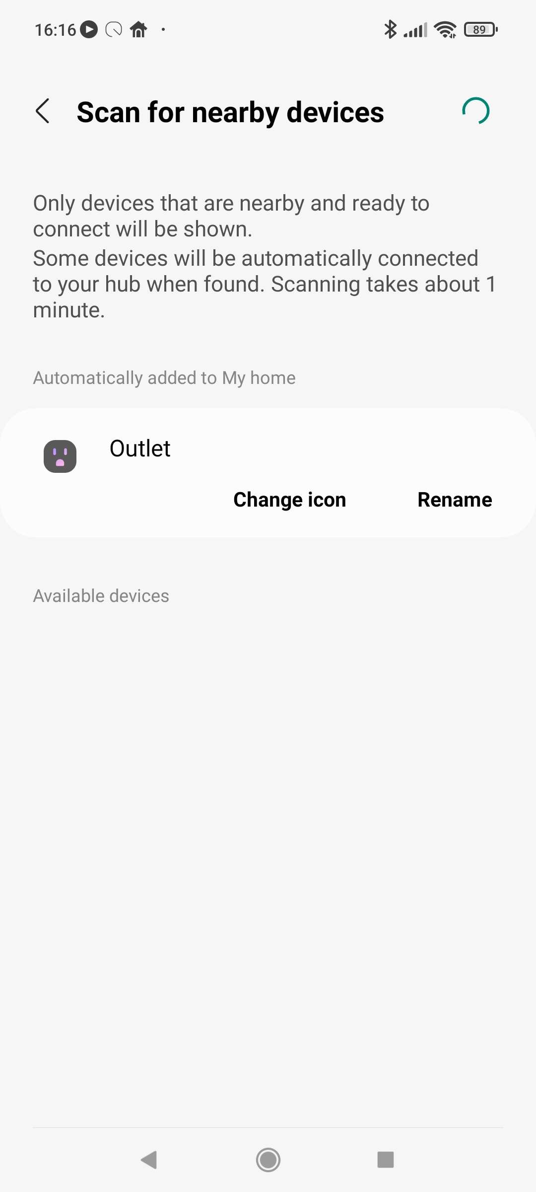 We gaan deze tussenstekker ook toevoegen aan de Smartthings hub van Aeotec. Dit kun je doen door naar je apparaten te gaan en op het plusje rechtsboven te klikken. We zoeken vervolgens op Blitzwolf maar hier wordt hij niet gevonden. Om hem toe te voegen gaan we gebruik maken van de scan optie. Als de scan is gestart moet je het knopje van de plug 5 seconden ingedrukt houden tot de LED paars gaat knipperen. Na enkele seconden wordt de plug gevonden als "generic device".