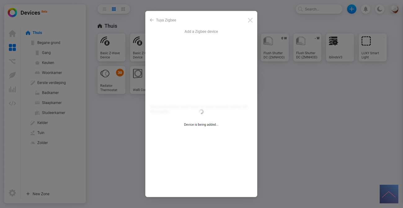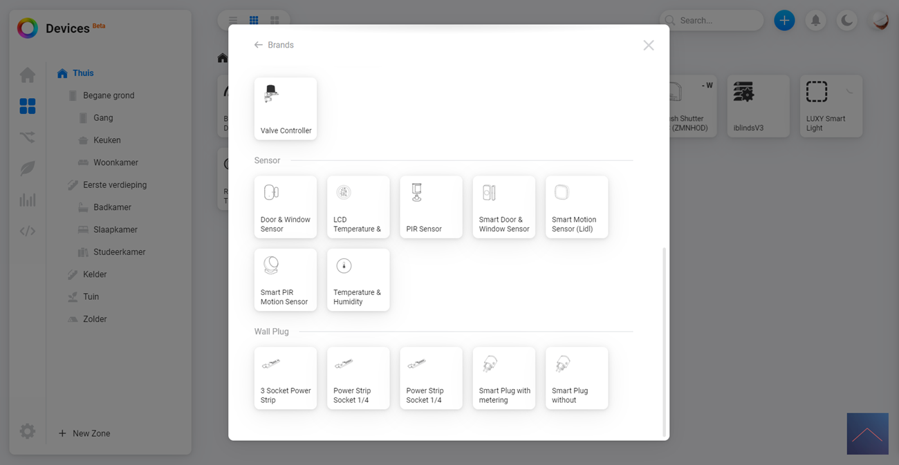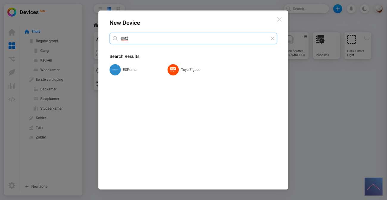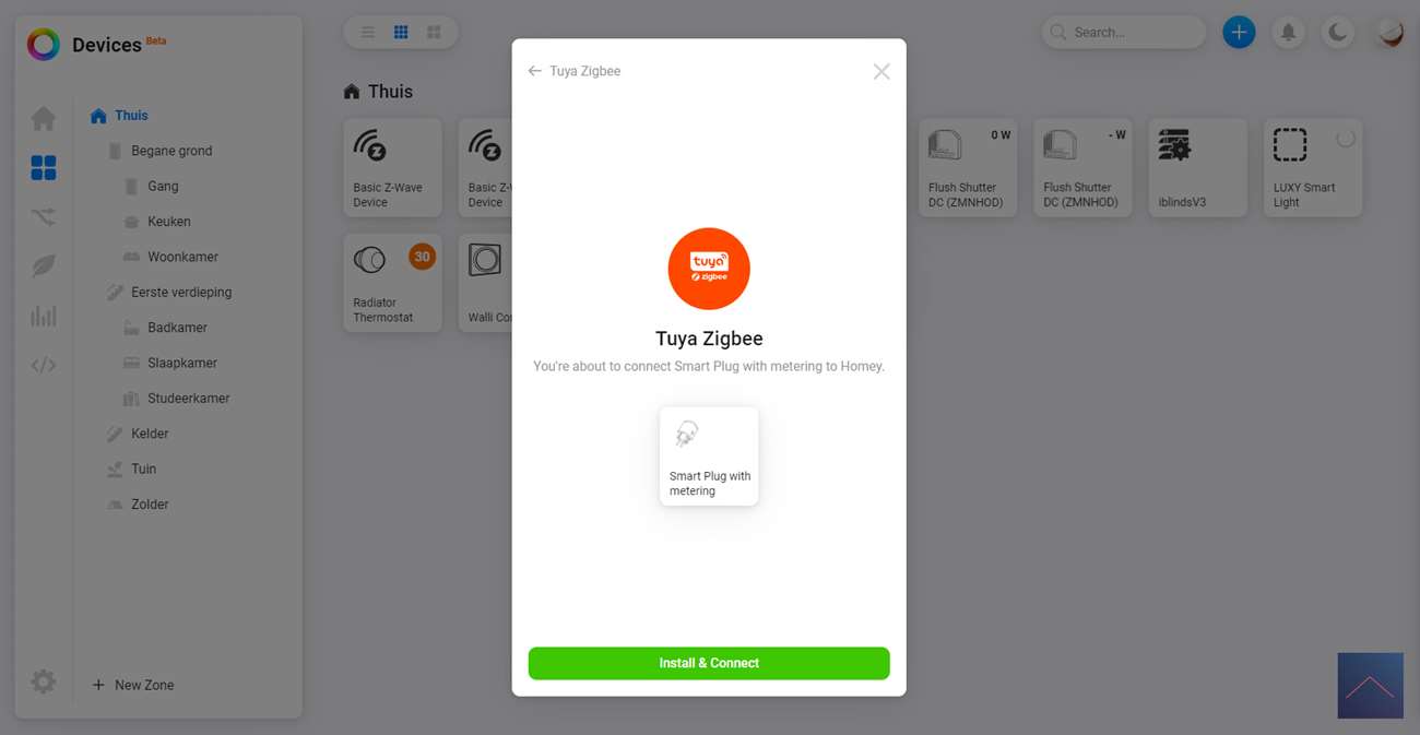 De eerste controller waar we de BlitzWolf mee gaan koppelen is de Homey. De Homey heeft een Zigbee chip ingebouwd dus het koppelen zou niet al te veel problemen moeten geven. We beginnen met het inloggen via de web-interface en naar onze apparaten te gaan. We klikken vervolgens op het plusje en drukken op 'nieuw apparaat toevoegen'. Nu zoeken we de BlitzWolf op, je ziet dat er resultaten komen maar het merk BlitzWolf komt niet naar voren. Dit komt omdat er geen aparte APP is maar je kunt de Tuya Zigbee APP gebruiken. Deze selecteren wij en zoeken de plug (met meter) op.